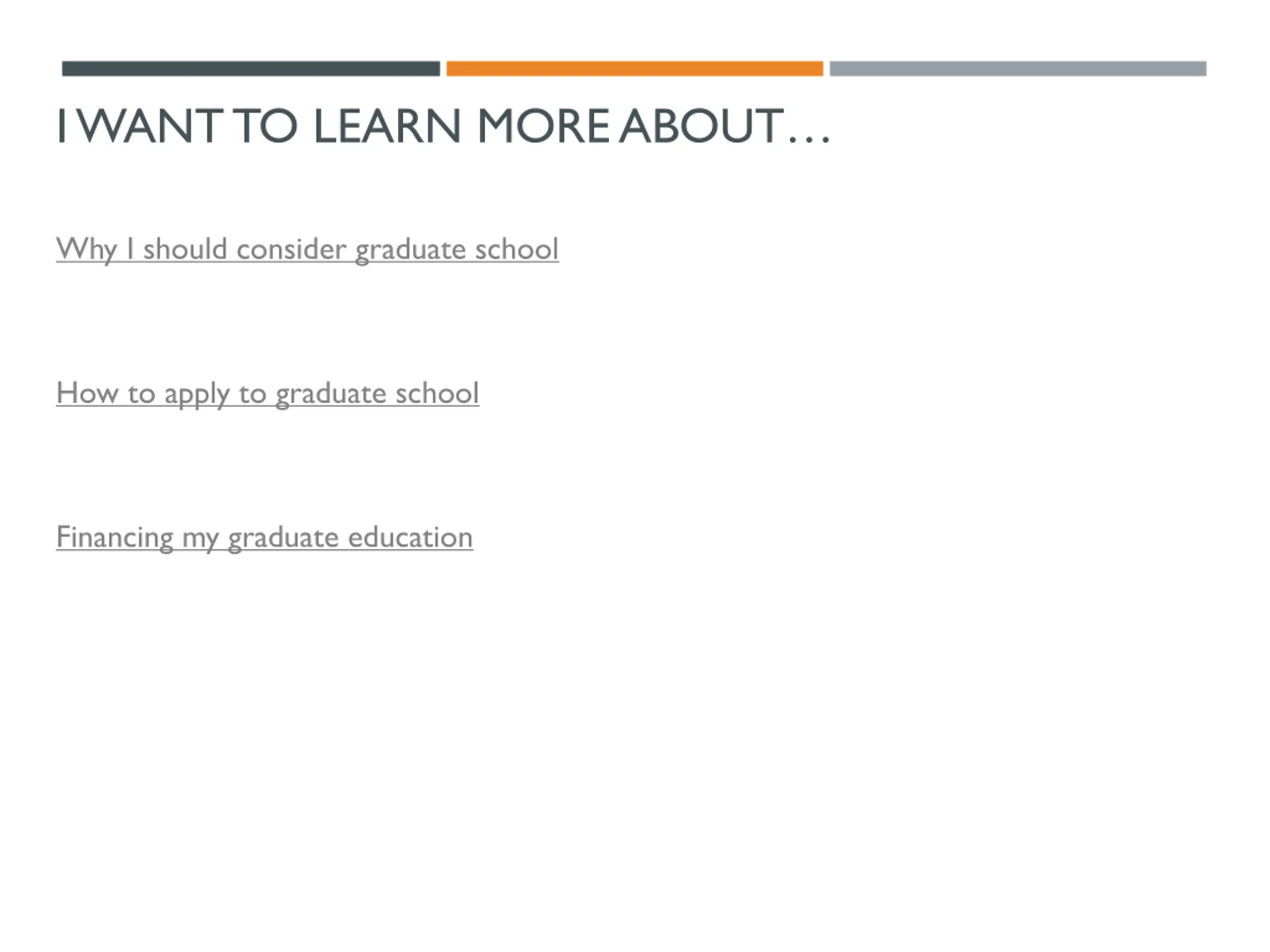 I WANT TO LEARN MORE ABOUT Why I should consider graduate school How to apply to graduate school Financing my graduate education