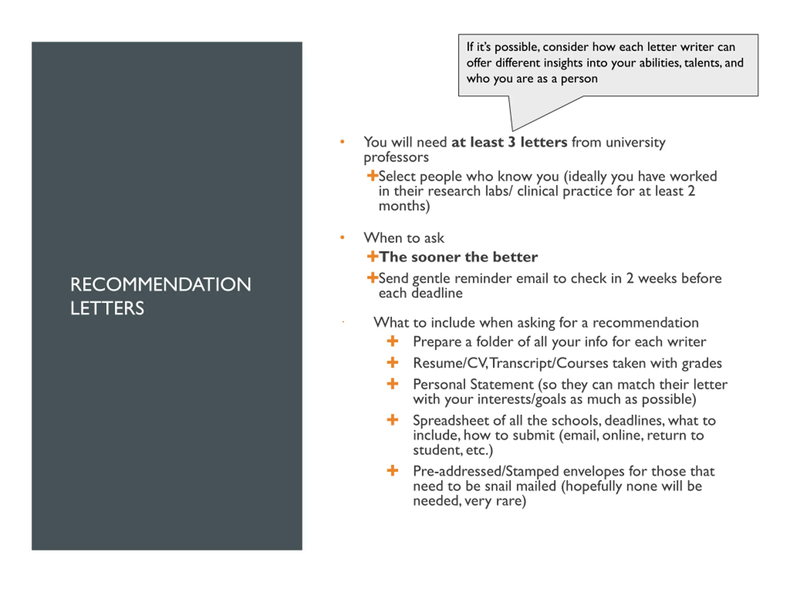 If its possible, consider how each letter writer can offer different insights into your abilities, talents, and who you are as a person You will need at least 3 letters from university professors Select people who know you (ideally you have worked in their research labs/ clinical practice for at least 2 months) When to ask The sooner the better Send gentle reminder email to check in 2 weeks before each deadline RECOMMENDATION LETTERS What to include when asking for a recommendation Prepare a folder of all your info for each writer Resume/CV, Transcript/Courses taken with grades Personal Statement (so they can match their letter with your interests/goals as much as possible) Spreadsheet of all the schools, deadlines, what to include, how to submit (email, online, return to student, etc.) Pre-addressed/Stamped envelopes for those that need to be snail mailed (hopefully none will be needed, very rare)