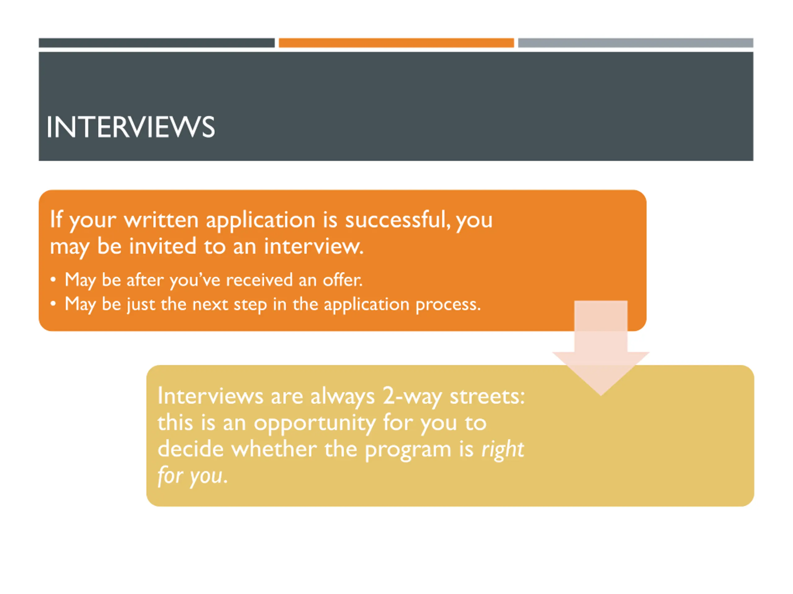 INTERVIEWS If your written application is successful, you may be invited to an interview. May be after you ve received an offer. May be just the next step in the application process. Interviews are always 2-way streets: this is an opportunity for you to decide whether the program is right for you.