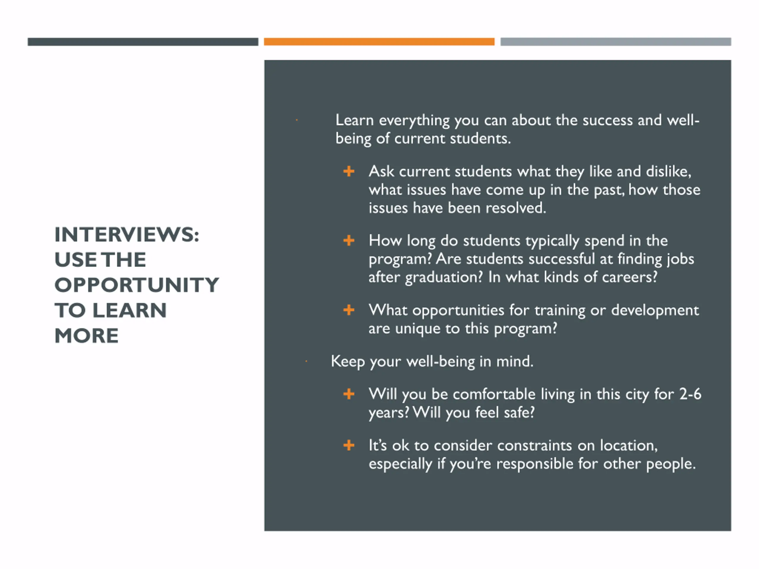 Learn everything you can about the success and well- being of current students. Ask current students what they like and dislike, what issues have come up in the past, how those issues have been resolved. INTERVIEWS: USE THE OPPORTUNITY TO LEARN MORE How long do students typically spend in the program? Are students successful at finding jobs after graduation? In what kinds of careers? What opportunities for training or development are unique to this program? Keep your well-being in mind. Will you be comfortable living in this city for 2-6 years? Will you feel safe? It s ok to consider constraints on location, especially if you re responsible for other people.