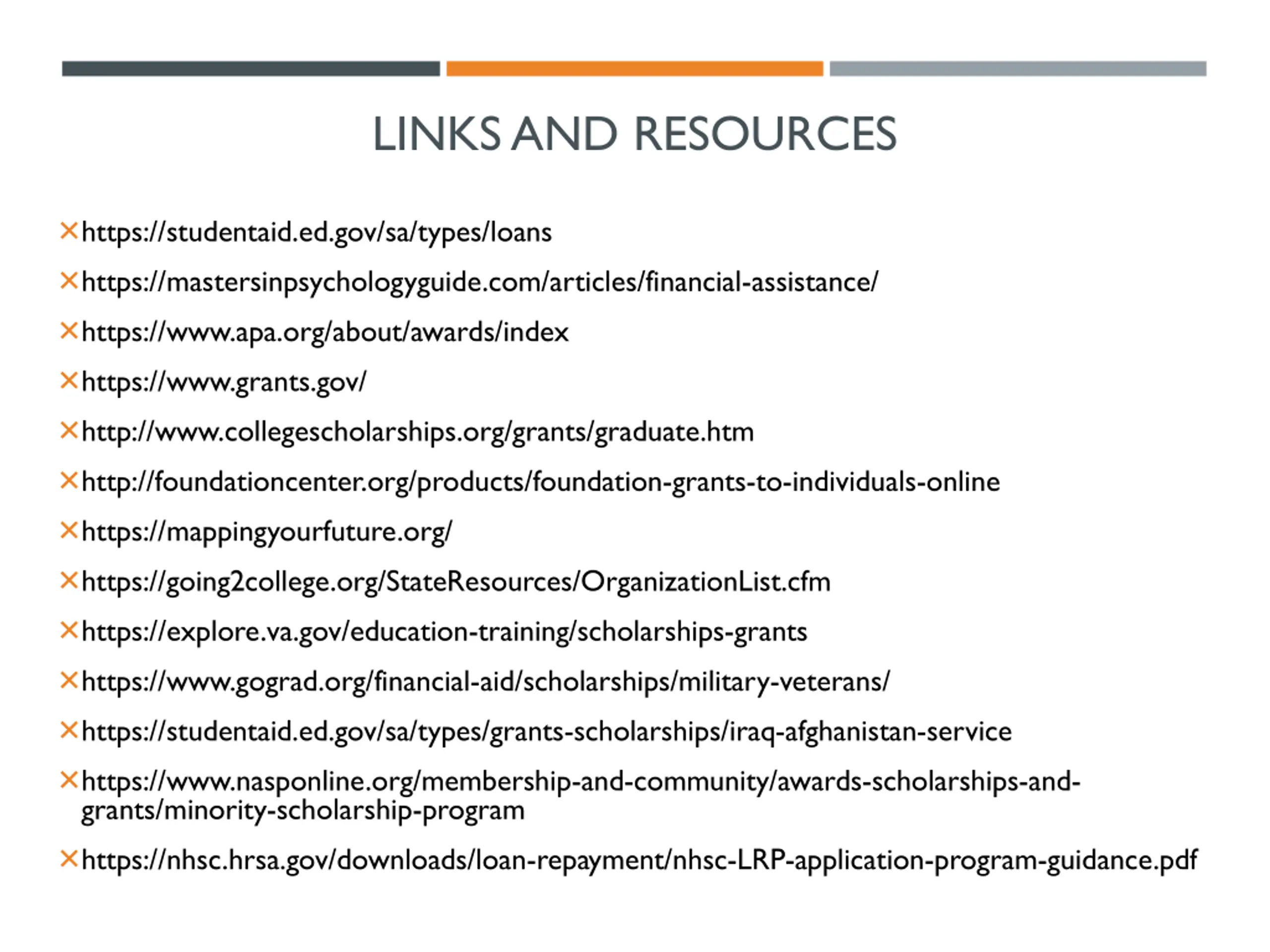 LINKS AND RESOURCES https://studentaid.ed.gov/sa/types/loans https://mastersinpsychologyguide.com/articles/financial-assistance/ https://www.apa.org/about/awards/index https://www.grants.gov/ http://www.collegescholarships.org/grants/graduate.htm http://foundationcenter.org/products/foundation-grants-to-individuals-online https://mappingyourfuture.org/ https://going2college.org/StateResources/OrganizationList.cfm https://explore.va.gov/education-training/scholarships-grants https://www.gograd.org/financial-aid/scholarships/military-veterans/ https://studentaid.ed.gov/sa/types/grants-scholarships/iraq-afghanistan-service https://www.nasponline.org/membership-and-community/awards-scholarships-and- grants/minority-scholarship-program https://nhsc.hrsa.gov/downloads/loan-repayment/nhsc-LRP-application-program-guidance.pdf