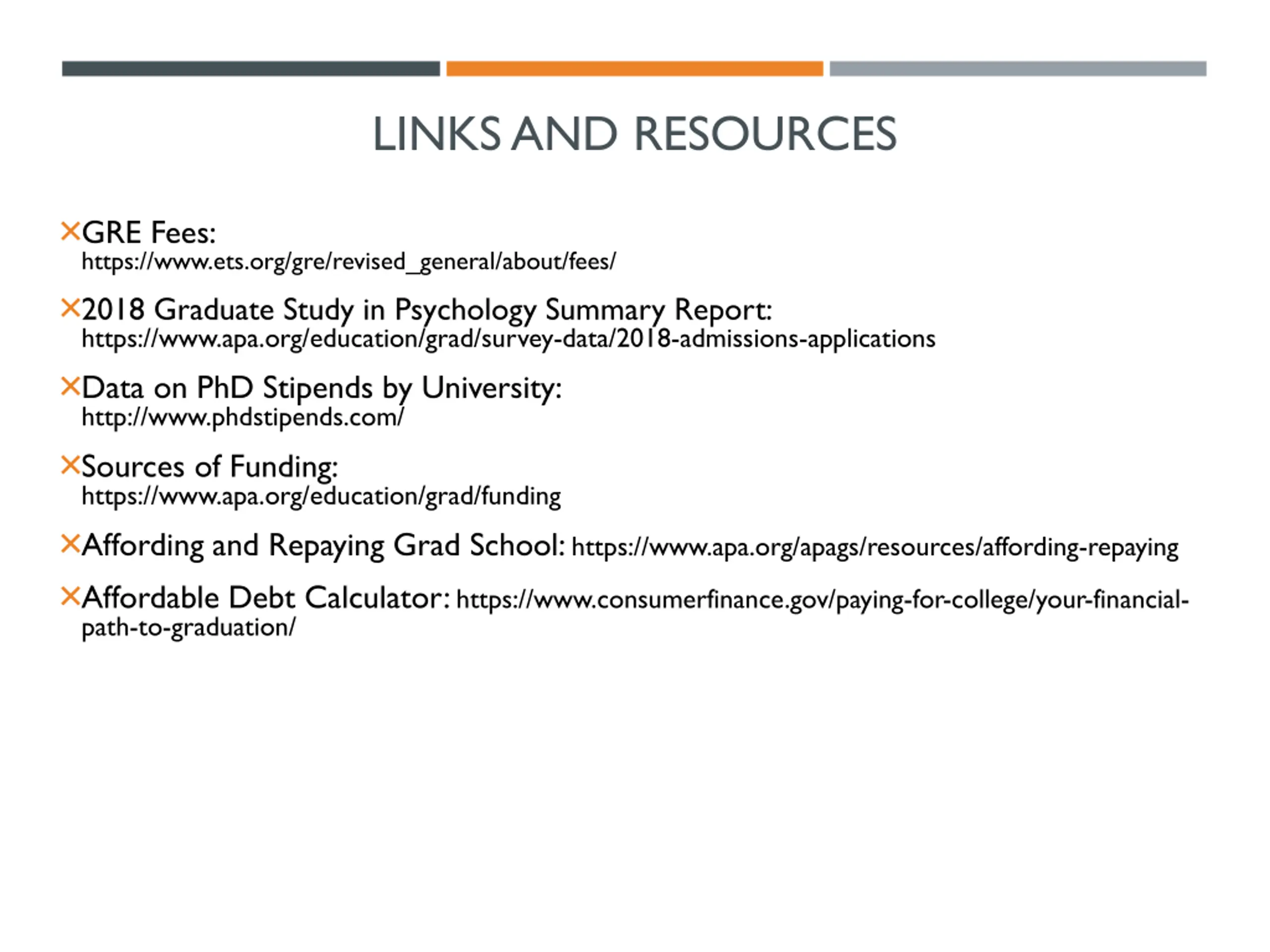LINKS AND RESOURCES GRE Fees: https://www.ets.org/gre/revised_general/about/fees/ 2018 Graduate Study in Psychology Summary Report: https://www.apa.org/education/grad/survey-data/2018-admissions-applications Data on PhD Stipends by University: http://www.phdstipends.com/ Sources of Funding: https://www.apa.org/education/grad/funding Affording and Repaying Grad School: https://www.apa.org/apags/resources/affording-repaying Affordable Debt Calculator: https://www.consumerfinance.gov/paying-for-college/your-financial- path-to-graduation/