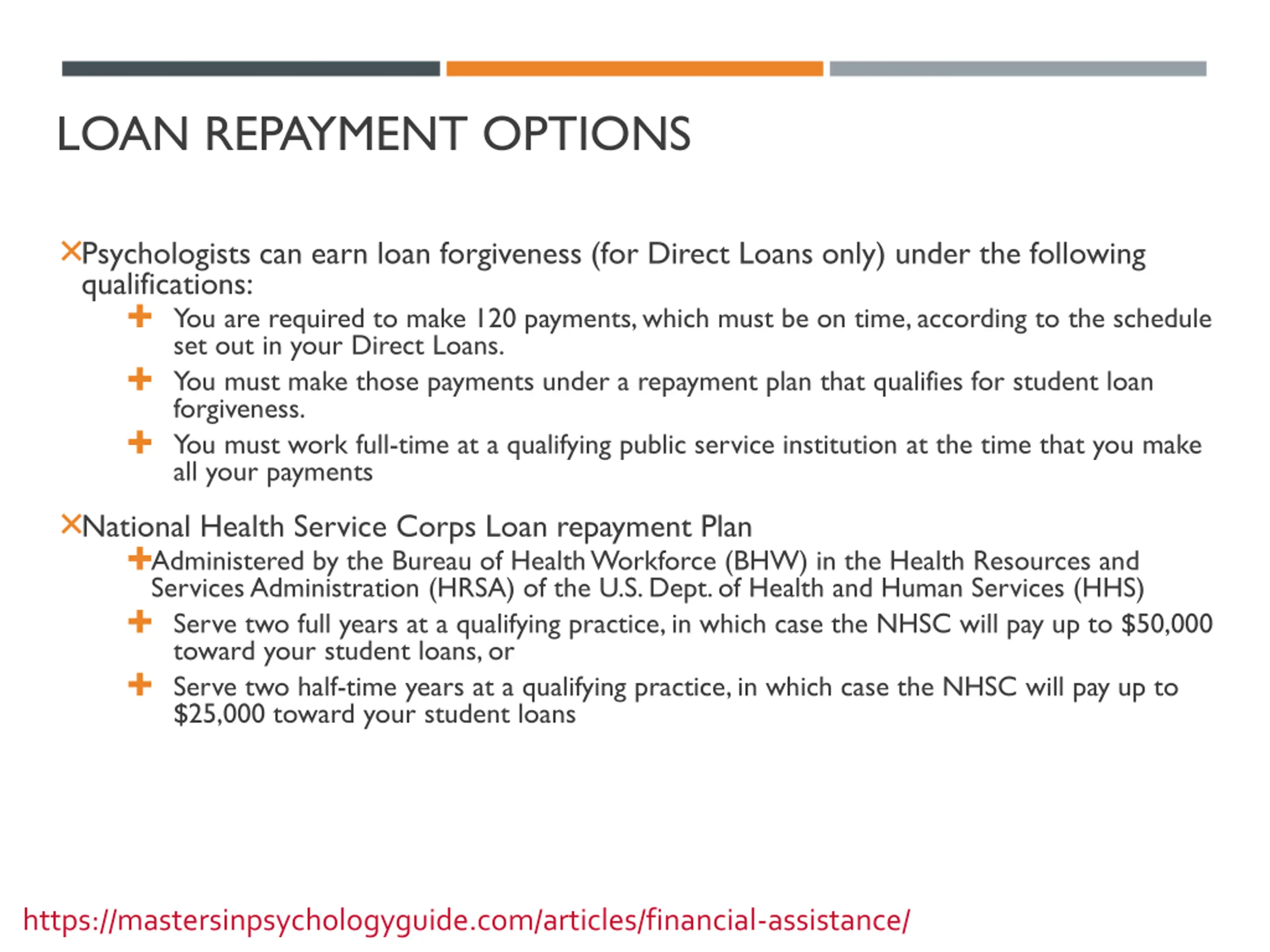 LOAN REPAYMENT OPTIONS Psychologists can earn loan forgiveness (for Direct Loans only) under the following qualifications: You are required to make 120 payments, which must be on time, according to the schedule set out in your Direct Loans. You must make those payments under a repayment plan that qualifies for student loan forgiveness. You must work full-time at a qualifying public service institution at the time that you make all your payments National Health Service Corps Loan repayment Plan Administered by the Bureau of Health Workforce (BHW) in the Health Resources and Services Administration (HRSA) of the U.S. Dept. of Health and Human Services (HHS) Serve two full years at a qualifying practice, in which case the NHSC will pay up to $50,000 toward your student loans, or Serve two half-time years at a qualifying practice, in which case the NHSC will pay up to $25,000 toward your student loans https://mastersinpsychologyguide.com/articles/financial-assistance/