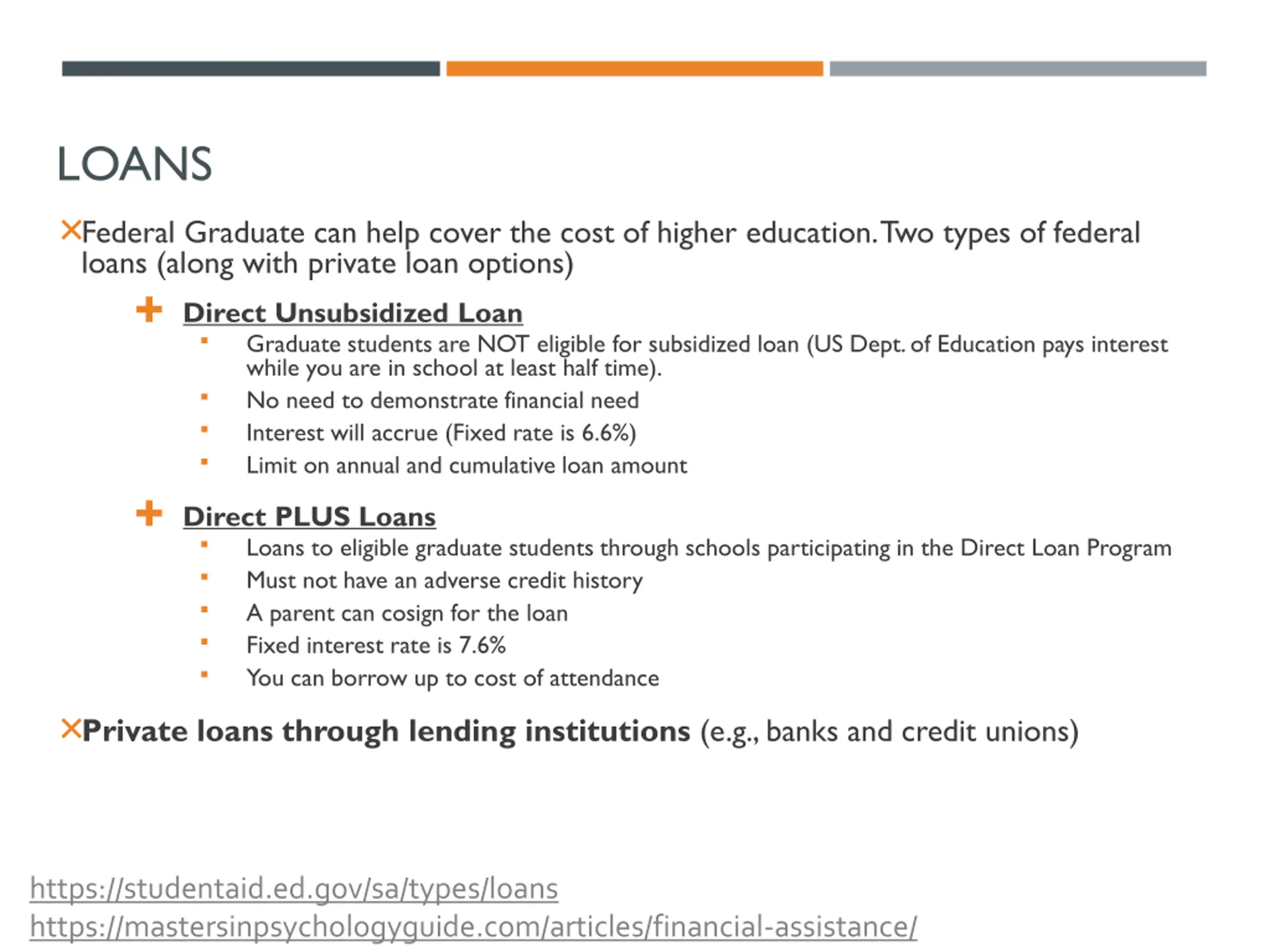 LOANS Federal Graduate can help cover the cost of higher education. Two types of federal loans (along with private loan options) Direct Unsubsidized Loan Graduate students are NOT eligible for subsidized loan (US Dept. of Education pays interest while you are in school at least half time). No need to demonstrate financial need Interest will accrue (Fixed rate is 6.6%) Limit on annual and cumulative loan amount Direct PLUS Loans Loans to eligible graduate students through schools participating in the Direct Loan Program Must not have an adverse credit history A parent can cosign for the loan Fixed interest rate is 7.6% You can borrow up to cost of attendance Private loans through lending institutions (e.g., banks and credit unions) https://studentaid.ed.gov/sa/types/loans https://mastersinpsychologyguide.com/articles/financial-assistance/