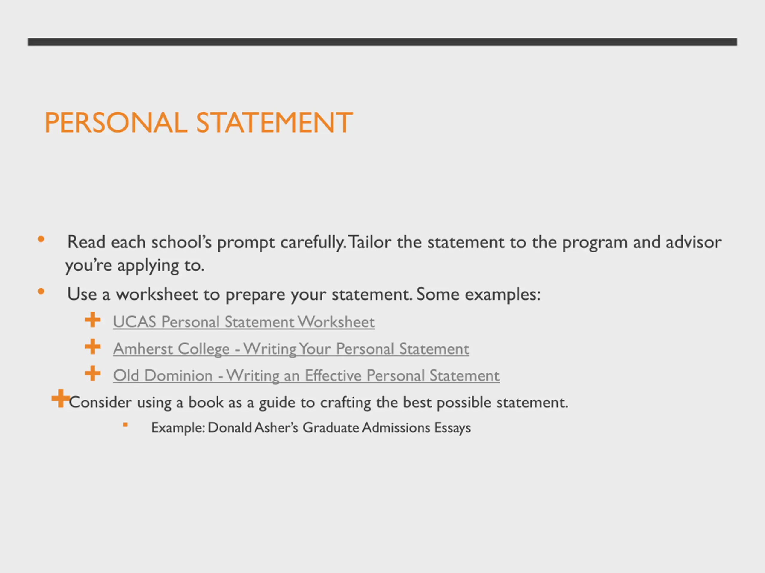 PERSONAL STATEMENT Read each school s prompt carefully. Tailor the statement to the program and advisor you re applying to. Use a worksheet to prepare your statement. Some examples: UCAS Personal Statement Worksheet Amherst College - Writing Your Personal Statement Old Dominion - Writing an Effective Personal Statement Consider using a book as a guide to crafting the best possible statement. Example: Donald Asher s Graduate Admissions Essays