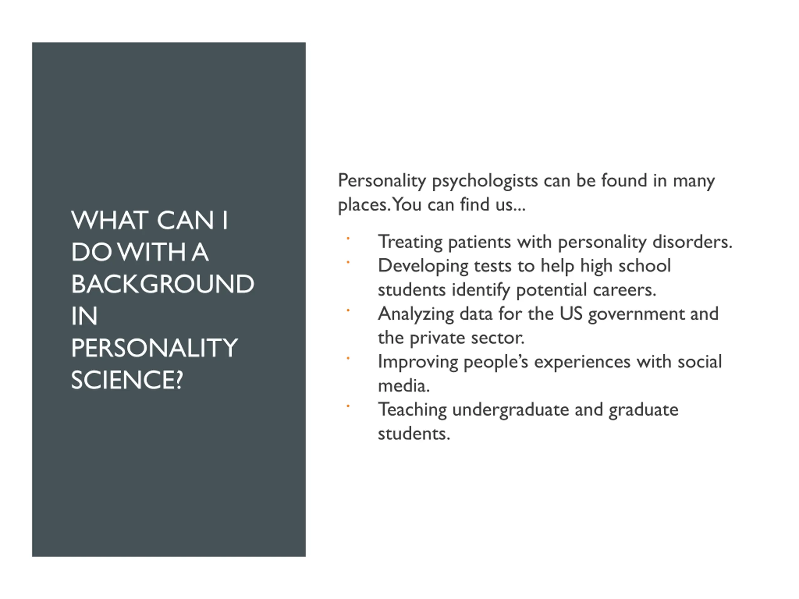 Personality psychologists can be found in many places. You can find us... Treating patients with personality disorders. Developing tests to help high school students identify potential careers. Analyzing data for the US government and the private sector. Improving people s experiences with social media. Teaching undergraduate and graduate students. WHAT CAN I DO WITH A BACKGROUND IN PERSONALITY SCIENCE?