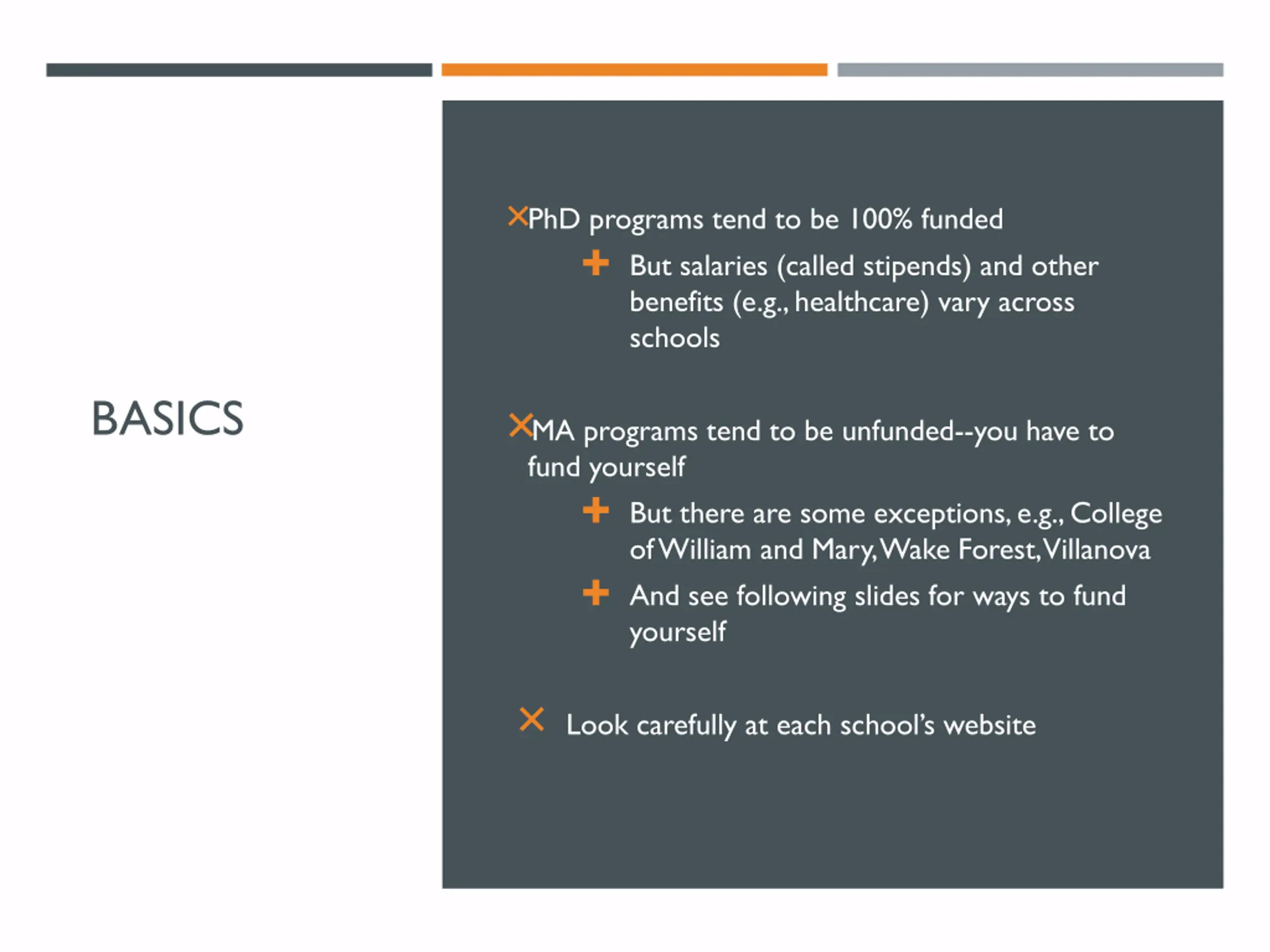 PhD programs tend to be 100% funded But salaries (called stipends) and other benefits (e.g., healthcare) vary across schools BASICS MA programs tend to be unfunded--you have to fund yourself But there are some exceptions, e.g., College of William and Mary, Wake Forest, Villanova And see following slides for ways to fund yourself Look carefully at each school s website