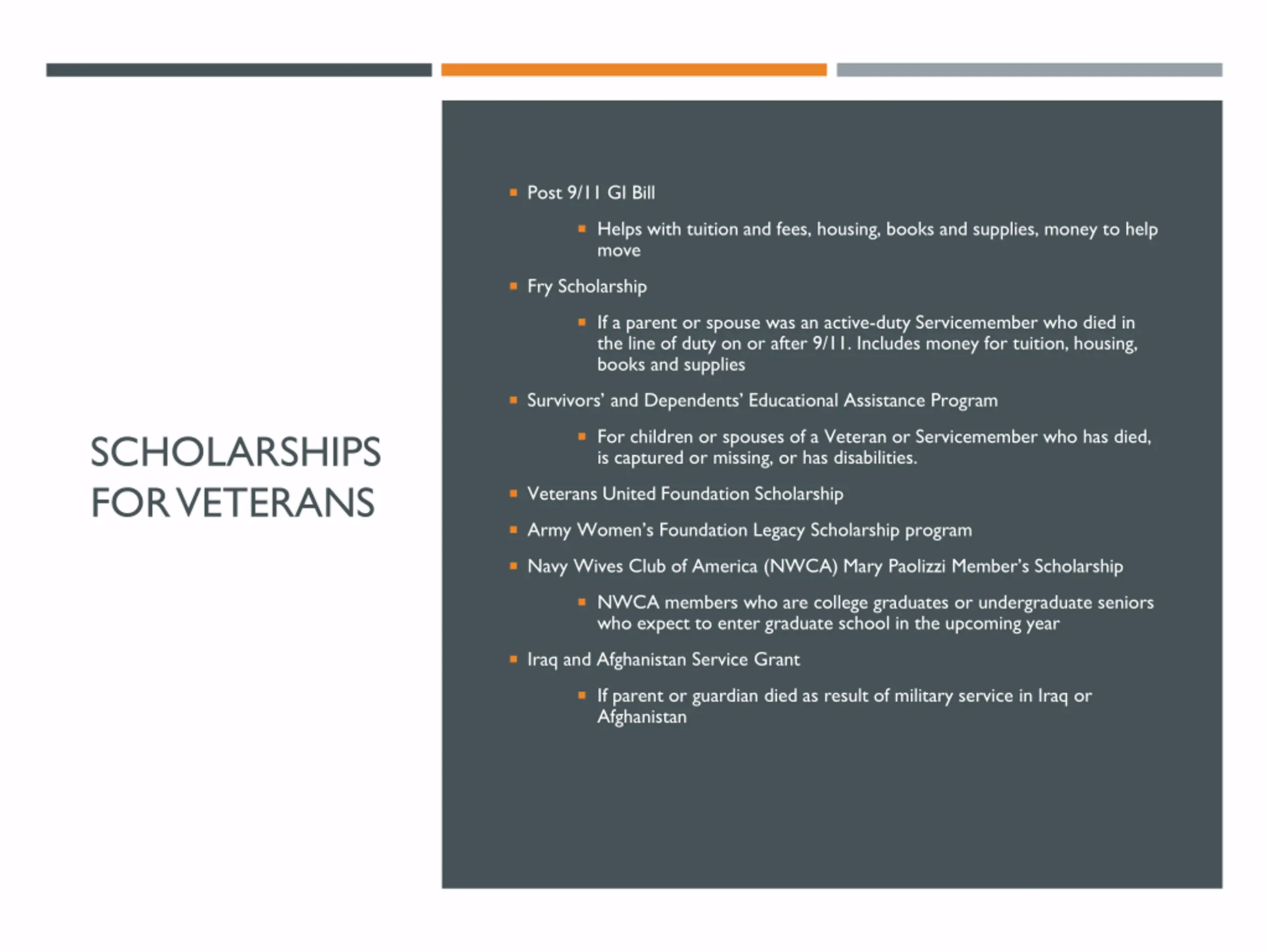 Post 9/11 GI Bill Helps with tuition and fees, housing, books and supplies, money to help move Fry Scholarship If a parent or spouse was an active-duty Servicemember who died in the line of duty on or after 9/11. Includes money for tuition, housing, books and supplies Survivors and Dependents Educational Assistance Program For children or spouses of a Veteran or Servicemember who has died, is captured or missing, or has disabilities. SCHOLARSHIPS FOR VETERANS Veterans United Foundation Scholarship Army Women s Foundation Legacy Scholarship program Navy Wives Club of America (NWCA) Mary Paolizzi Member s Scholarship NWCA members who are college graduates or undergraduate seniors who expect to enter graduate school in the upcoming year Iraq and Afghanistan Service Grant If parent or guardian died as result of military service in Iraq or Afghanistan