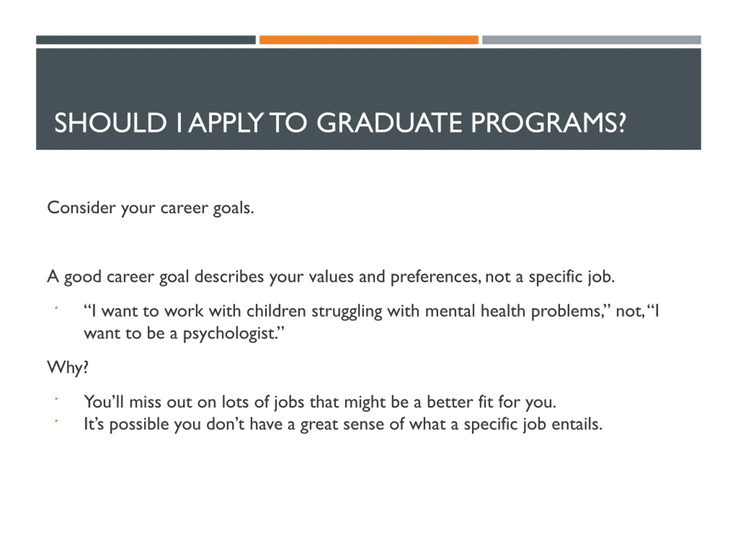 SHOULD I APPLY TO GRADUATE PROGRAMS? Consider your career goals. A good career goal describes your values and preferences, not a specific job. I want to work with children struggling with mental health problems, not, I want to be a psychologist. Why? You ll miss out on lots of jobs that might be a better fit for you. It s possible you don t have a great sense of what a specific job entails.