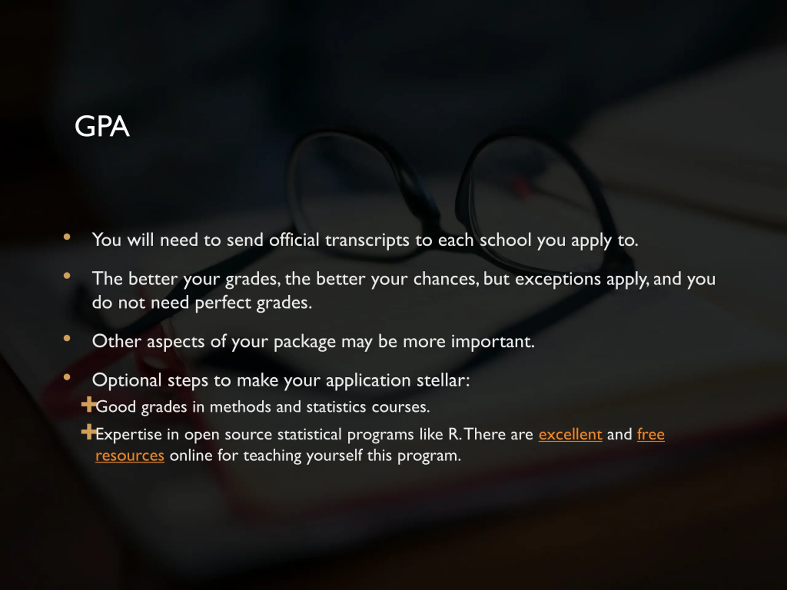 GPA You will need to send official transcripts to each school you apply to. The better your grades, the better your chances, but exceptions apply, and you do not need perfect grades. Other aspects of your package may be more important. Optional steps to make your application stellar: Good grades in methods and statistics courses. Expertise in open source statistical programs like R. There are excellent and free resources online for teaching yourself this program.