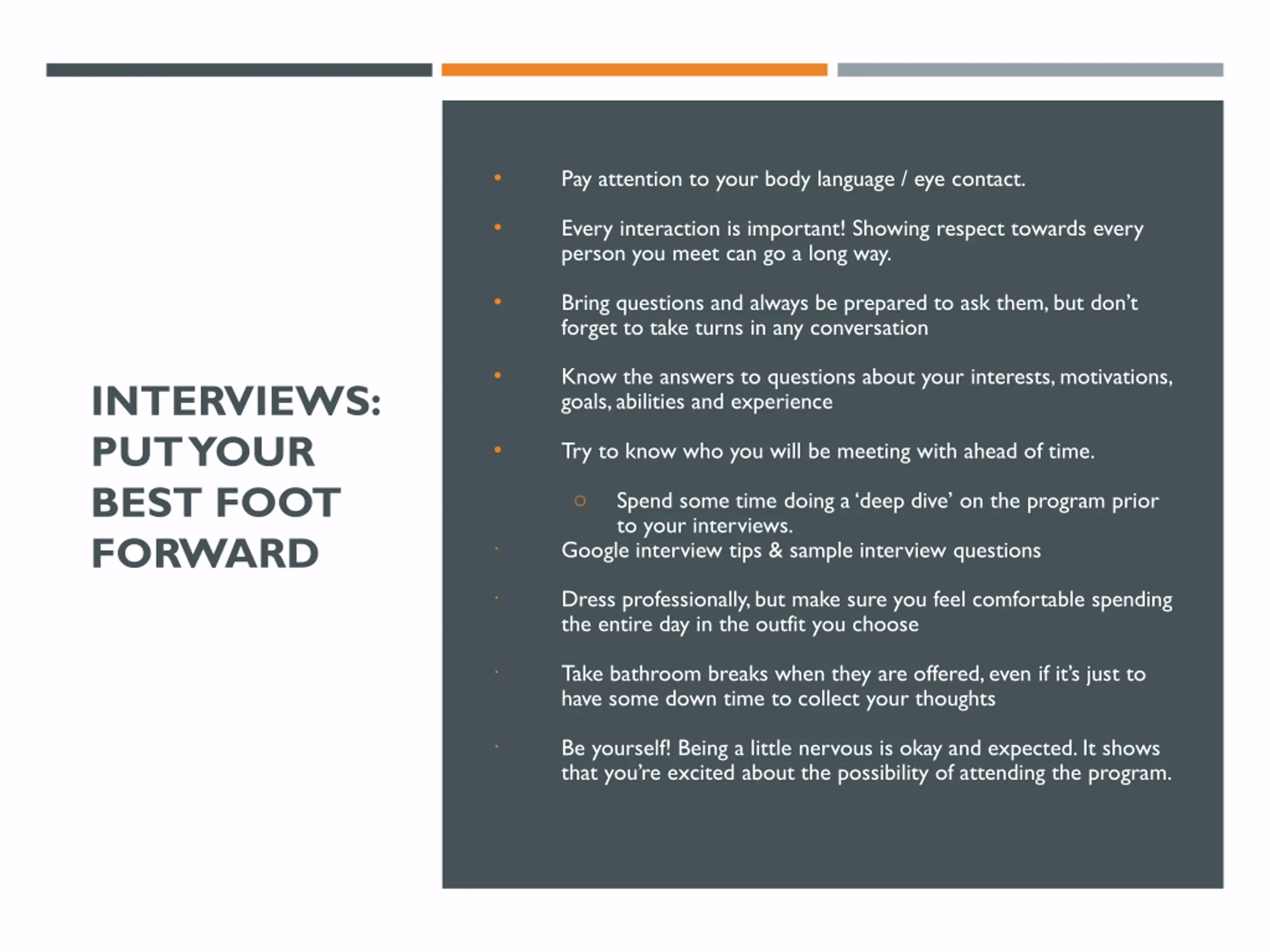 Pay attention to your body language / eye contact. Every interaction is important! Showing respect towards every person you meet can go a long way. Bring questions and always be prepared to ask them, but don t forget to take turns in any conversation Know the answers to questions about your interests, motivations, goals, abilities and experience INTERVIEWS: PUT YOUR BEST FOOT FORWARD Try to know who you will be meeting with ahead of time. Spend some time doing a deep dive on the program prior to your interviews. Google interview tips & sample interview questions Dress professionally, but make sure you feel comfortable spending the entire day in the outfit you choose Take bathroom breaks when they are offered, even if it s just to have some down time to collect your thoughts Be yourself! Being a little nervous is okay and expected. It shows that you re excited about the possibility of attending the program.