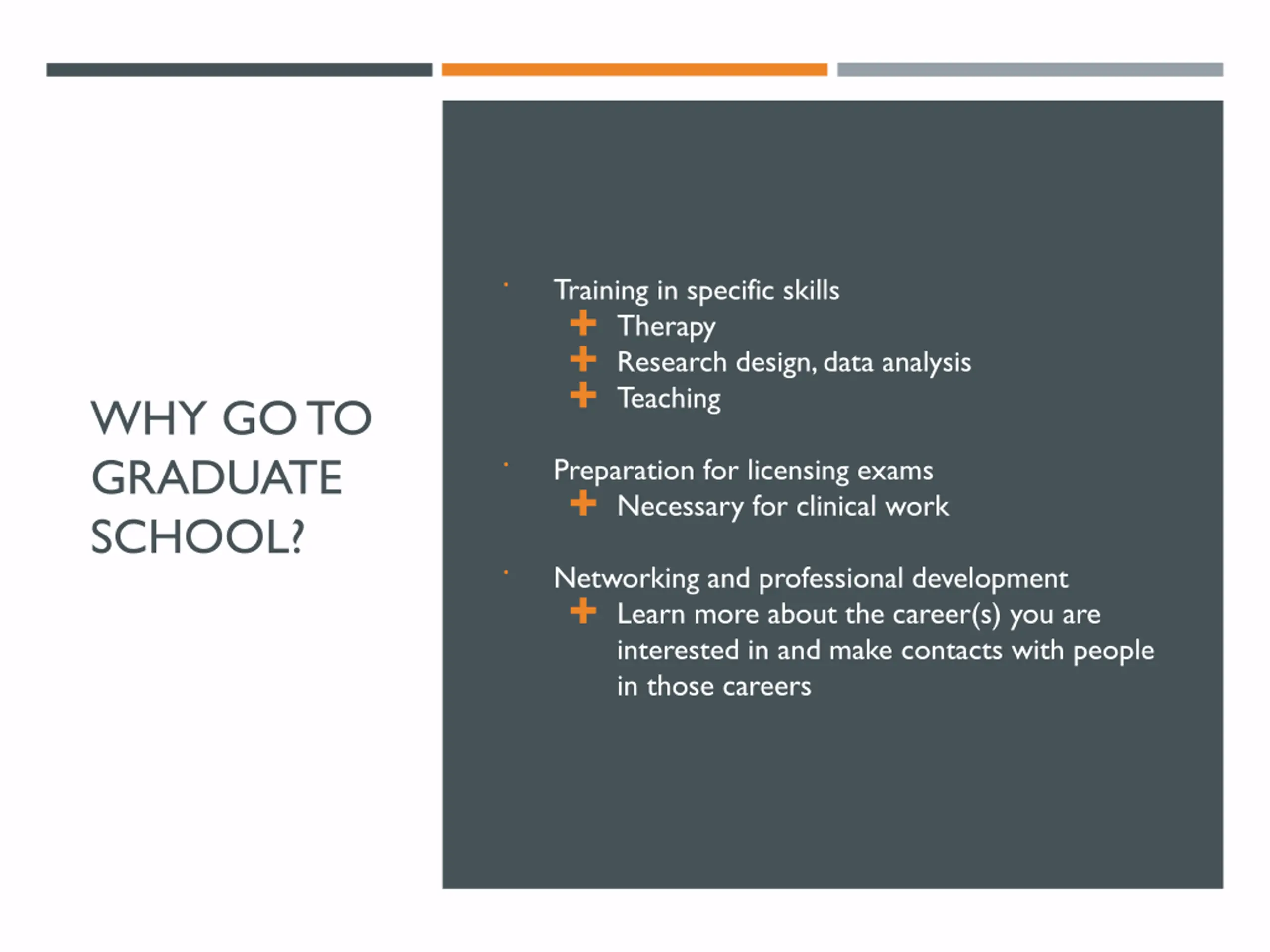 Training in specific skills Therapy Research design, data analysis Teaching WHY GO TO GRADUATE SCHOOL? Preparation for licensing exams Necessary for clinical work Networking and professional development Learn more about the career(s) you are interested in and make contacts with people in those careers