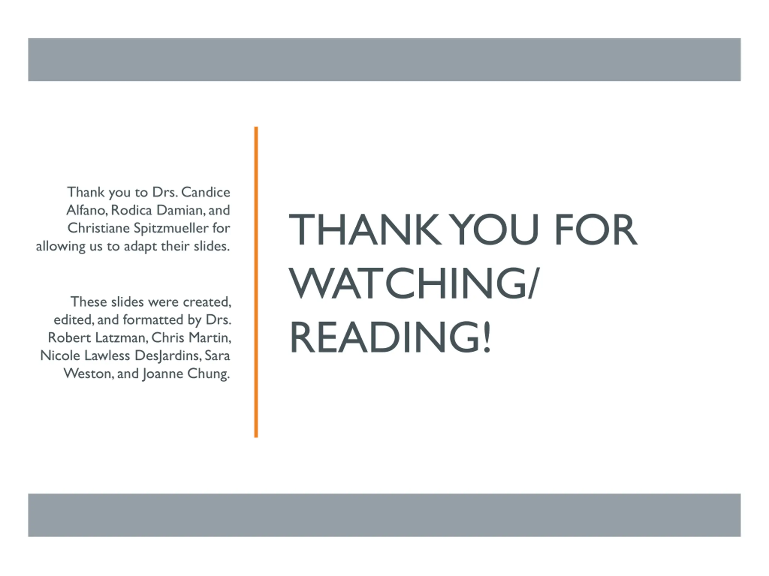 Thank you to Drs. Candice Alfano, Rodica Damian, and Christiane Spitzmueller for allowing us to adapt their slides. THANK YOU FOR WATCHING/ READING! These slides were created, edited, and formatted by Drs. Robert Latzman, Chris Martin, Nicole Lawless DesJardins, Sara Weston, and Joanne Chung.