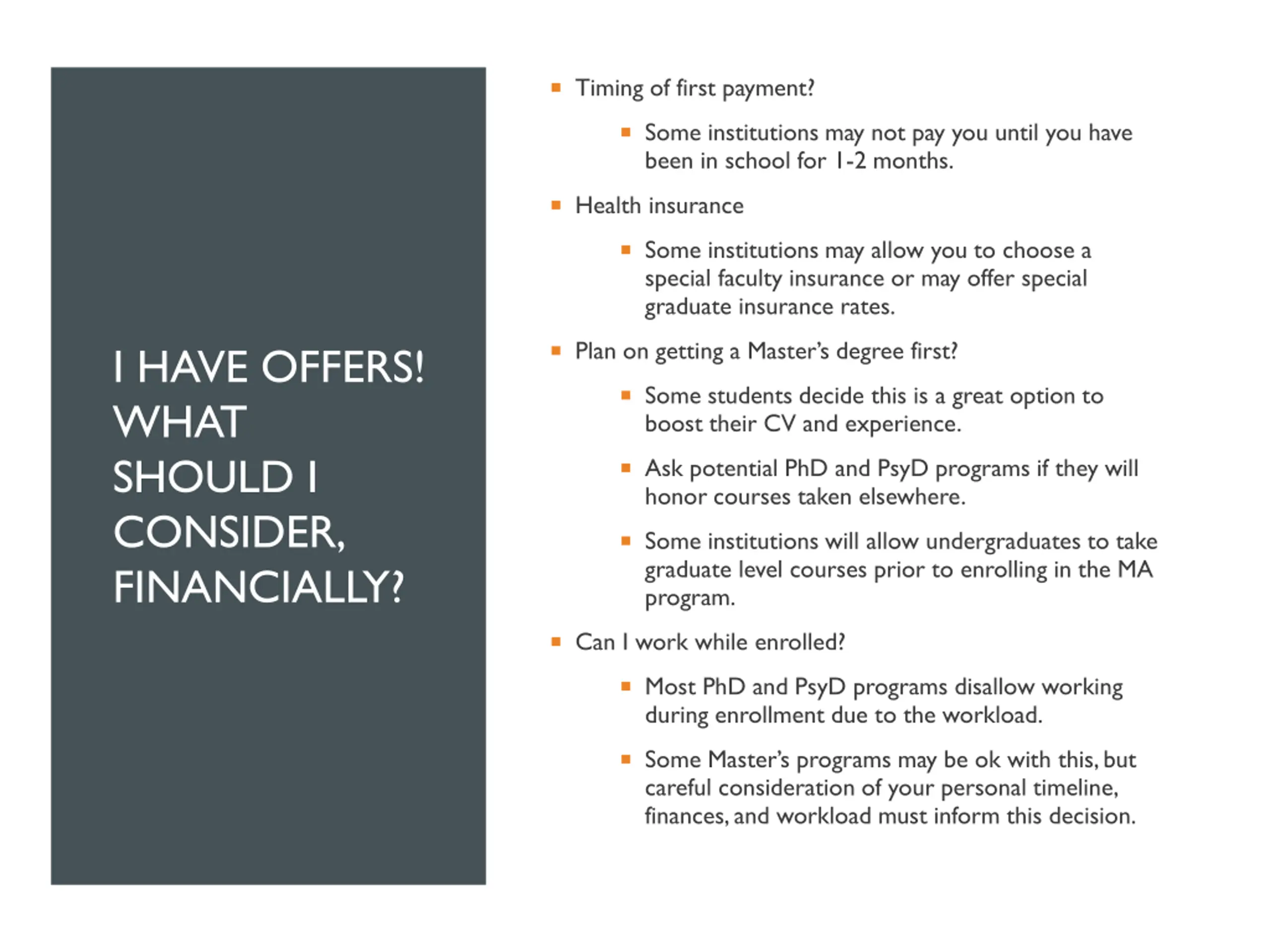 Timing of first payment? Some institutions may not pay you until you have been in school for 1-2 months. Health insurance Some institutions may allow you to choose a special faculty insurance or may offer special graduate insurance rates. Plan on getting a Master s degree first? I HAVE OFFERS! WHAT SHOULD I CONSIDER, FINANCIALLY? Some students decide this is a great option to boost their CV and experience. Ask potential PhD and PsyD programs if they will honor courses taken elsewhere. Some institutions will allow undergraduates to take graduate level courses prior to enrolling in the MA program. Can I work while enrolled? Most PhD and PsyD programs disallow working during enrollment due to the workload. Some Master s programs may be ok with this, but careful consideration of your personal timeline, finances, and workload must inform this decision.