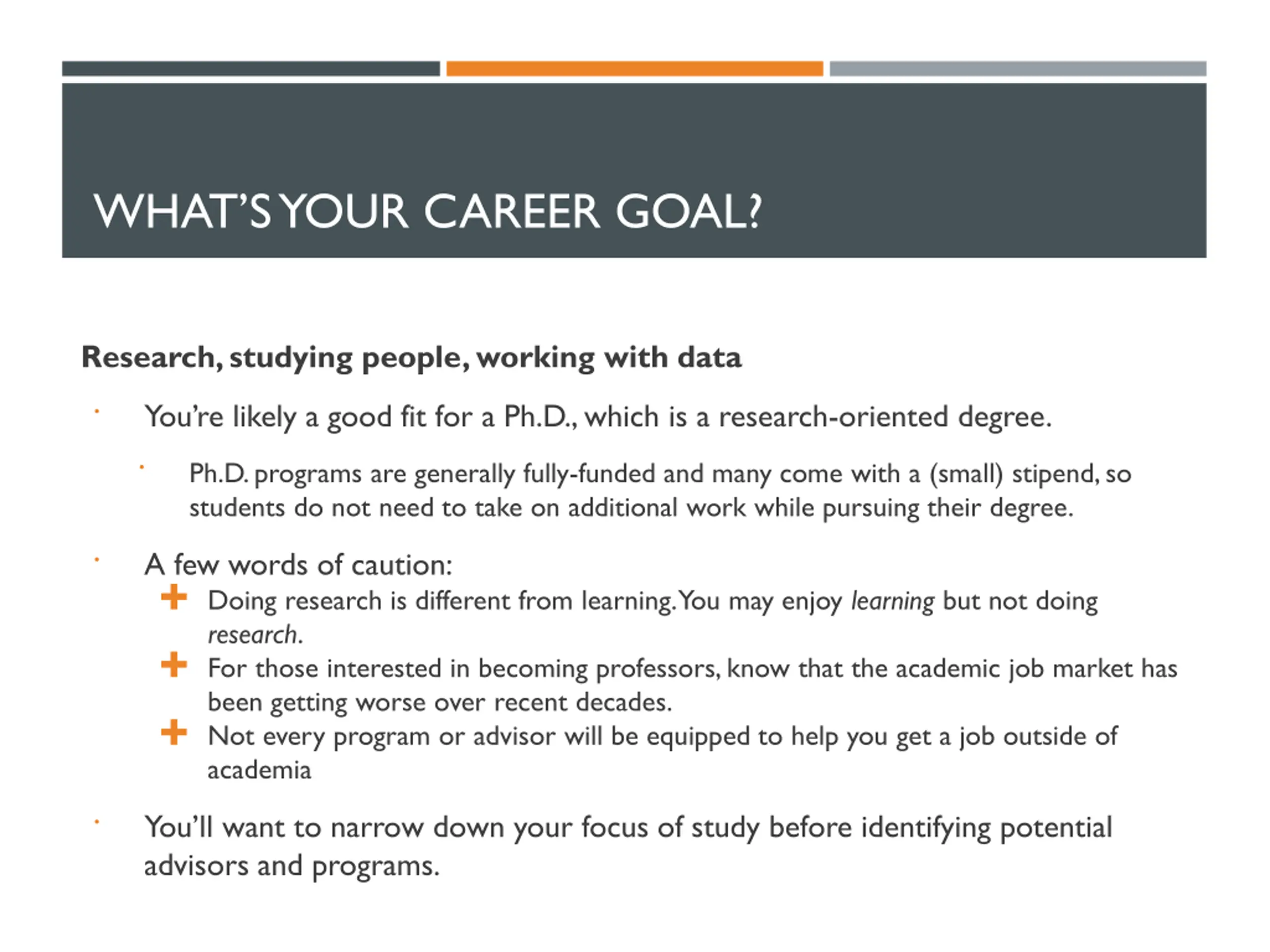 WHATS YOUR CAREER GOAL? Research, studying people, working with data You re likely a good fit for a Ph.D., which is a research-oriented degree. Ph.D. programs are generally fully-funded and many come with a (small) stipend, so students do not need to take on additional work while pursuing their degree. A few words of caution: Doing research is different from learning. You may enjoy learning but not doing research. For those interested in becoming professors, know that the academic job market has been getting worse over recent decades. Not every program or advisor will be equipped to help you get a job outside of academia You ll want to narrow down your focus of study before identifying potential advisors and programs.
