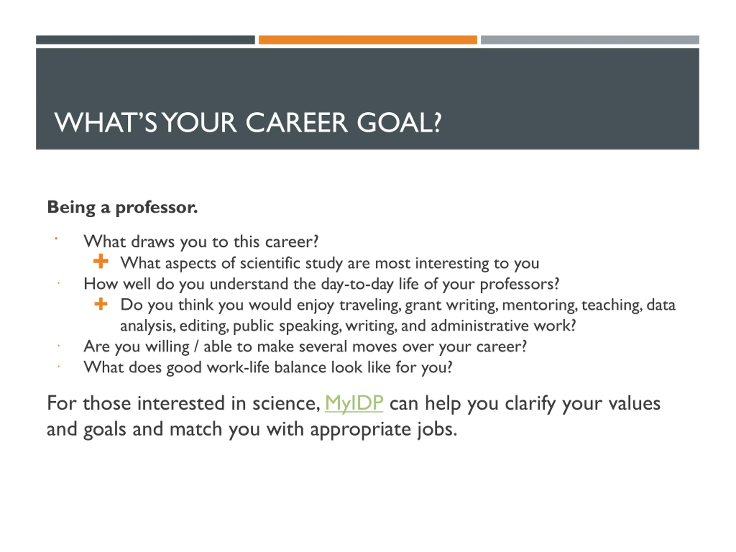 WHATS YOUR CAREER GOAL? Being a professor. What draws you to this career? What aspects of scientific study are most interesting to you How well do you understand the day-to-day life of your professors? Do you think you would enjoy traveling, grant writing, mentoring, teaching, data analysis, editing, public speaking, writing, and administrative work? Are you willing / able to make several moves over your career? What does good work-life balance look like for you? For those interested in science, MyIDP can help you clarify your values and goals and match you with appropriate jobs.