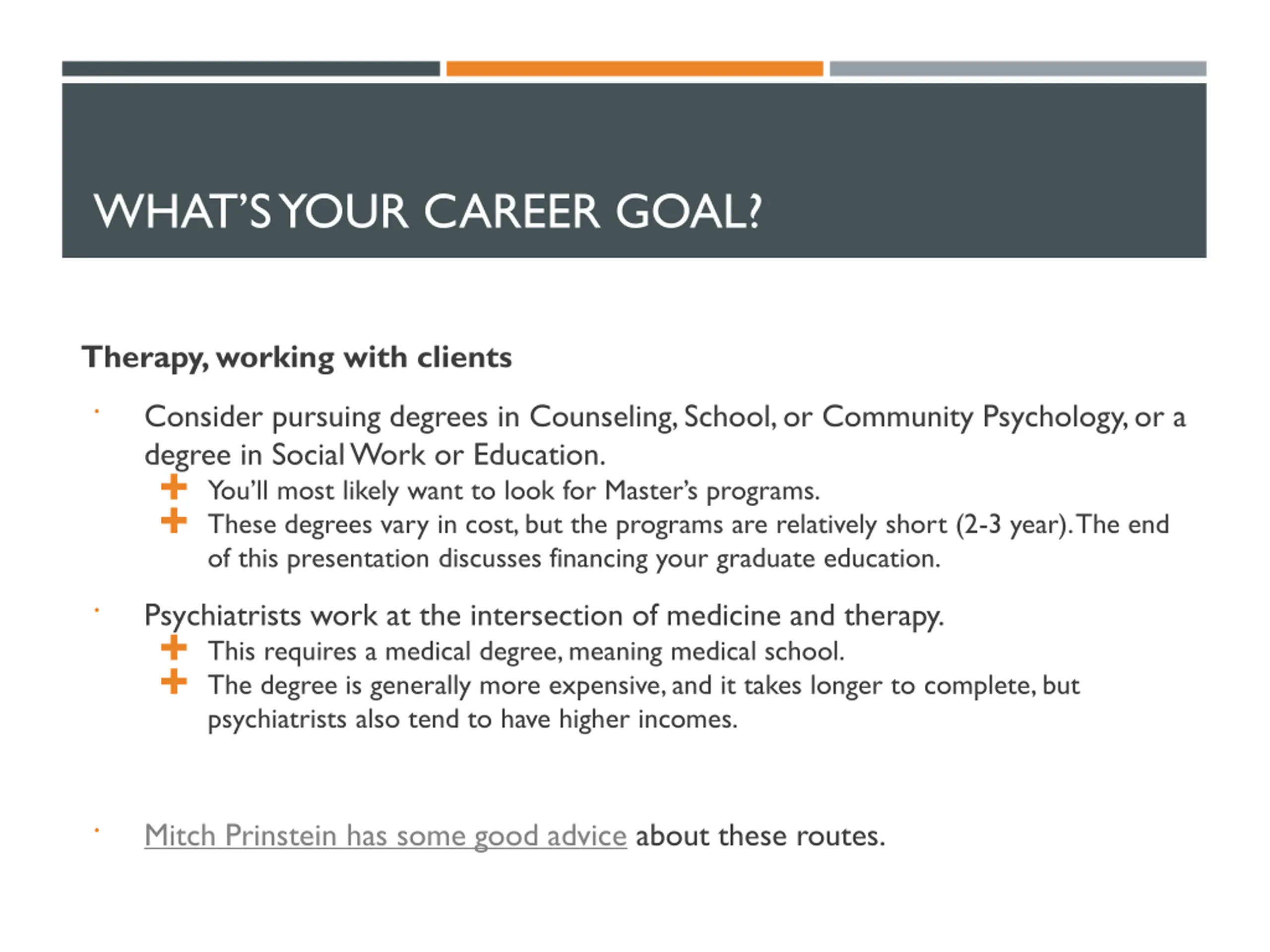 WHATS YOUR CAREER GOAL? Therapy, working with clients Consider pursuing degrees in Counseling, School, or Community Psychology, or a degree in Social Work or Education. You ll most likely want to look for Master s programs. These degrees vary in cost, but the programs are relatively short (2-3 year). The end of this presentation discusses financing your graduate education. Psychiatrists work at the intersection of medicine and therapy. This requires a medical degree, meaning medical school. The degree is generally more expensive, and it takes longer to complete, but psychiatrists also tend to have higher incomes. Mitch Prinstein has some good advice about these routes.