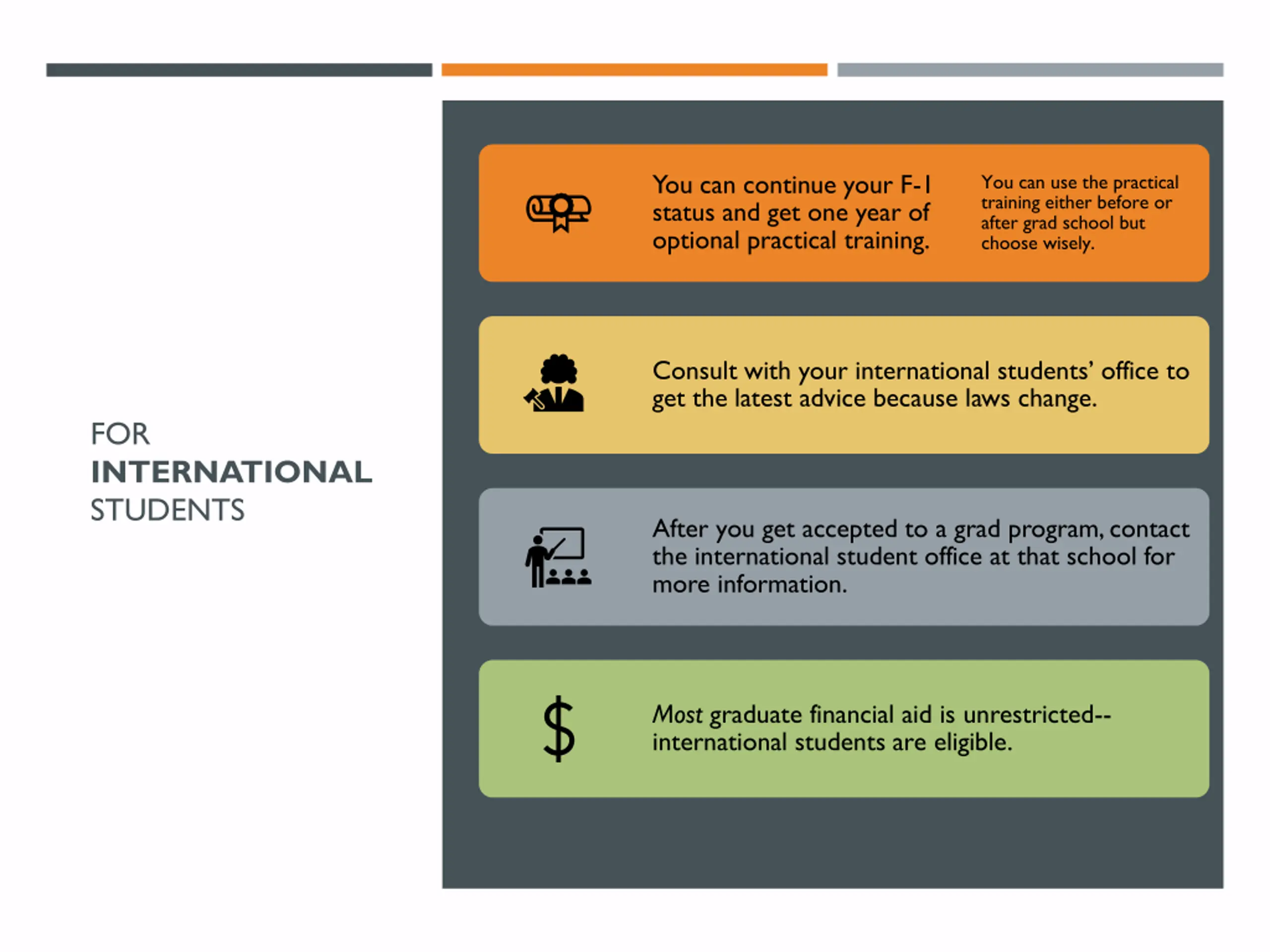 You can continue your F-1 status and get one year of optional practical training. You can use the practical training either before or after grad school but choose wisely. Consult with your international students office to get the latest advice because laws change. FOR INTERNATIONAL STUDENTS After you get accepted to a grad program, contact the international student office at that school for more information. Most graduate financial aid is unrestricted-- international students are eligible.
