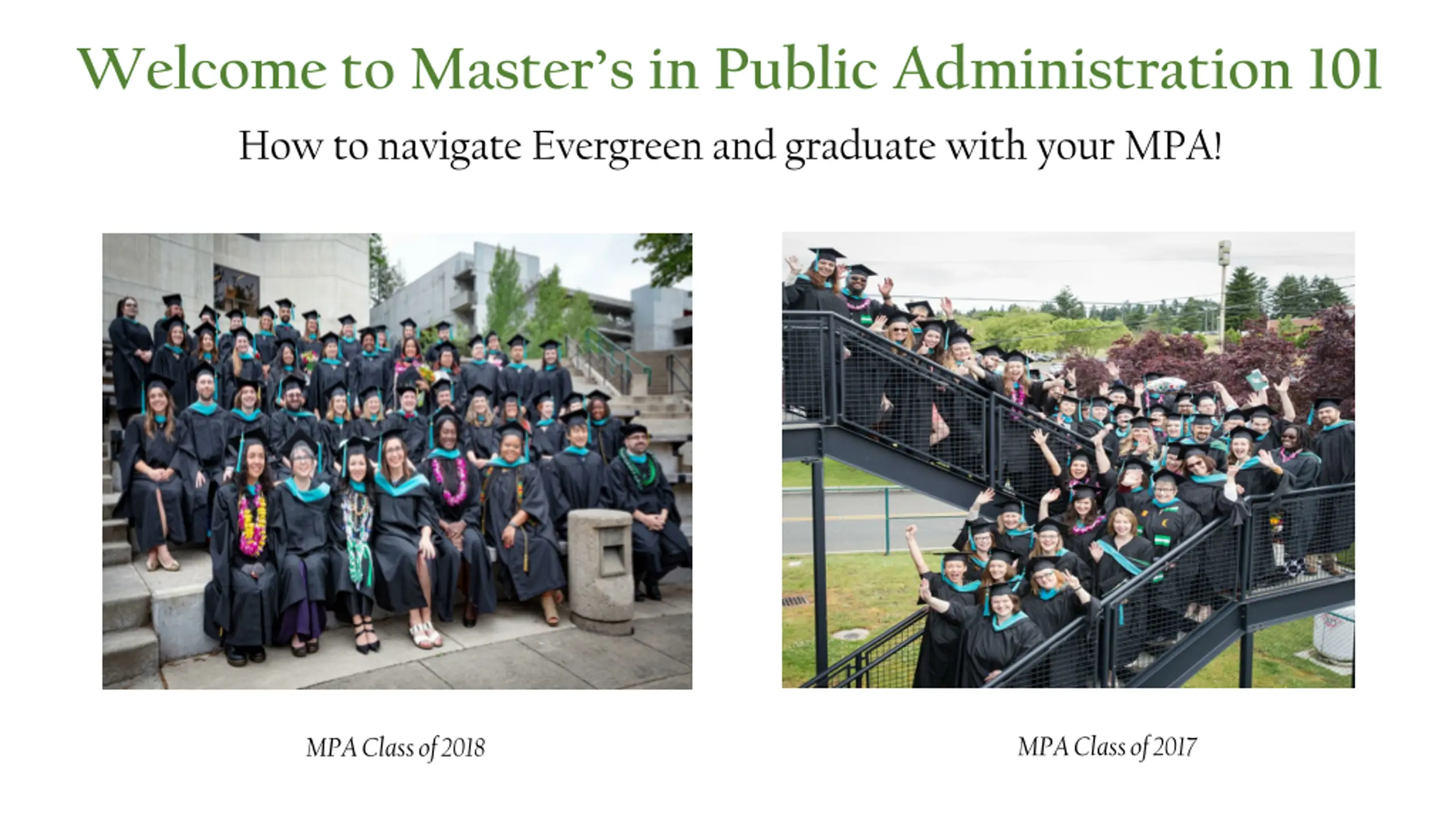 Welcome to Masters in Public Administration 101 How to navigate Evergreen and graduate with your MPA! MPA Class of 2017 MPA Class of 2018