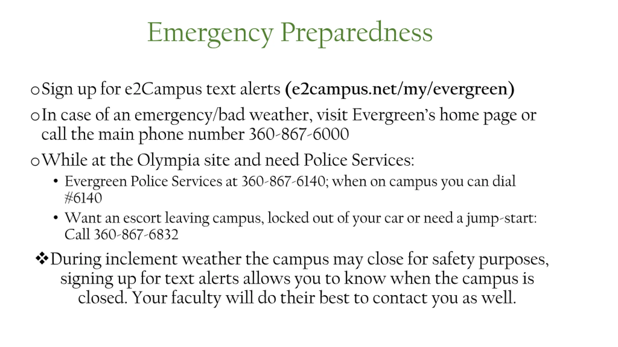 Emergency Preparedness oSign up for e2Campus text alerts (e2campus.net/my/evergreen) oIn case of an emergency/bad weather, visit Evergreen s home page or call the main phone number 360-867-6000 oWhile at the Olympia site and need Police Services: Evergreen Police Services at 360-867-6140; when on campus you can dial #6140 Want an escort leaving campus, locked out of your car or need a jump-start: Call 360-867-6832 During inclement weather the campus may close for safety purposes, signing up for text alerts allows you to know when the campus is closed. Your faculty will do their best to contact you as well.