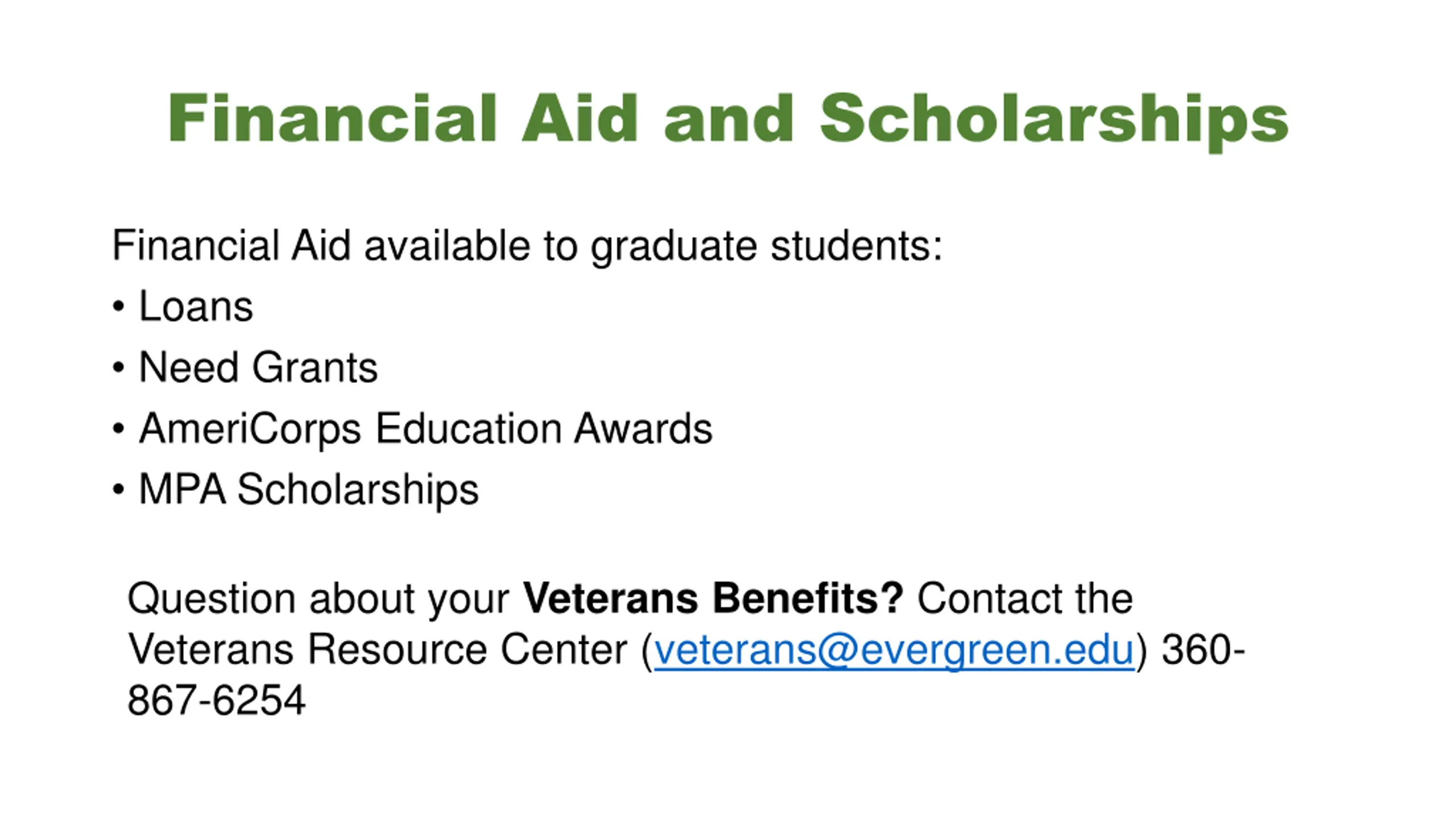 Financial Aid and Scholarships Financial Aid available to graduate students: Loans Need Grants AmeriCorps Education Awards MPA Scholarships Question about your Veterans Benefits? Contact the Veterans Resource Center (veterans@evergreen.edu) 360- 867-6254