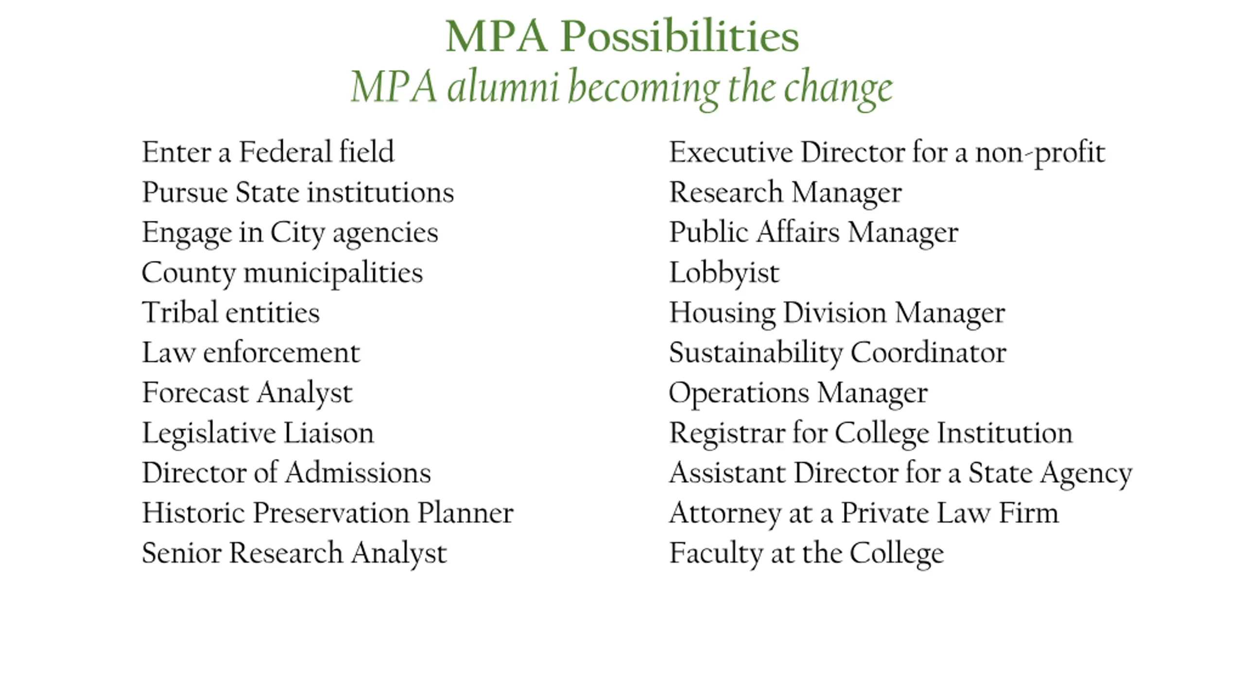 MPA Possibilities MPA alumni becoming the change Enter a Federal field Pursue State institutions Engage in City agencies County municipalities Tribal entities Law enforcement Forecast Analyst Legislative Liaison Director of Admissions Historic Preservation Planner Senior Research Analyst Executive Director for a non-profit Research Manager Public Affairs Manager Lobbyist Housing Division Manager Sustainability Coordinator Operations Manager Registrar for College Institution Assistant Director for a State Agency Attorney at a Private Law Firm Faculty at the College