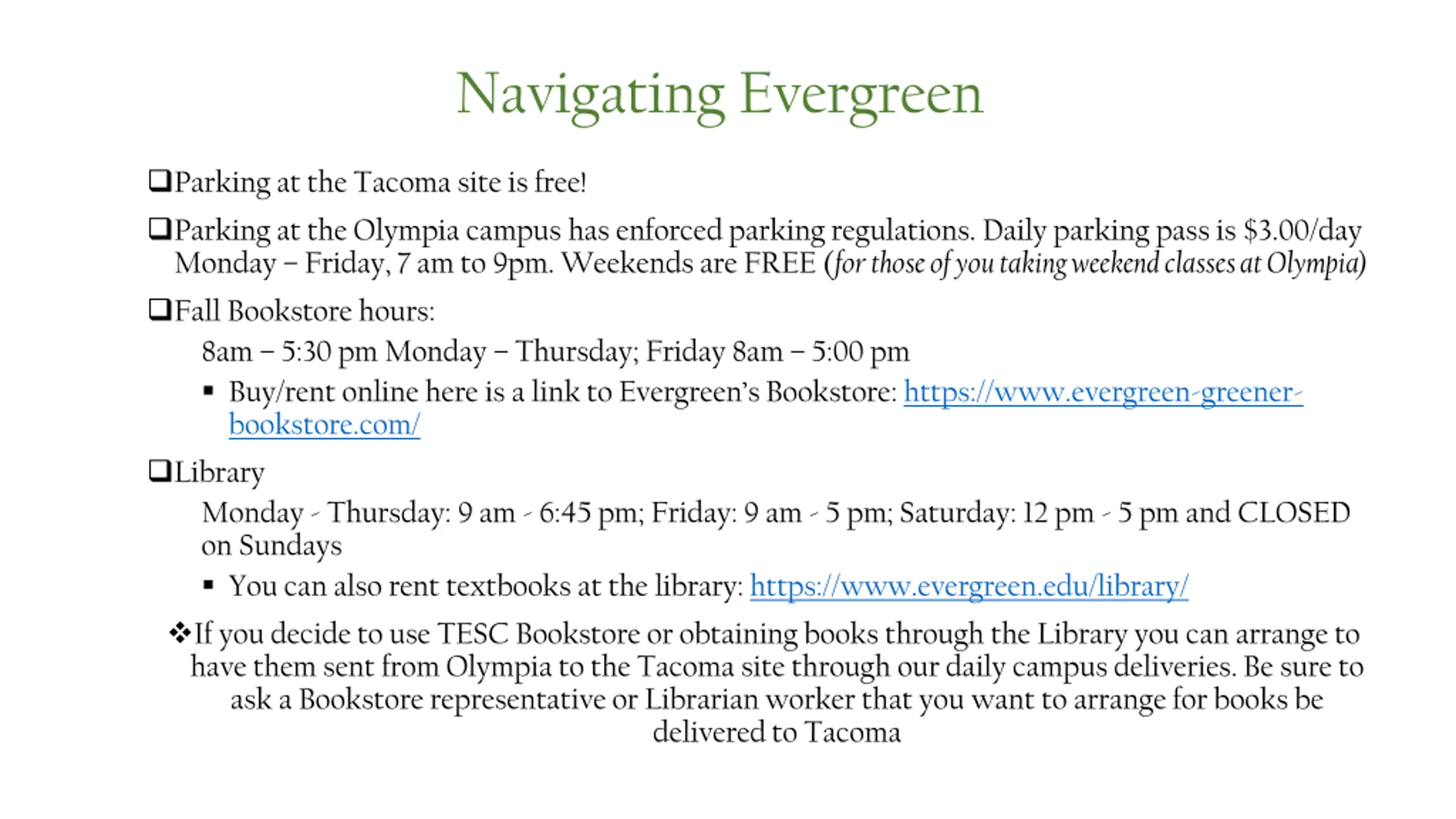 Navigating Evergreen Parking at the Tacoma site is free! Parking at the Olympia campushas enforced parking regulations. Daily parking pass is $3.00/day Monday Friday, 7 am to 9pm. Weekends are FREE (for those of you taking weekend classes at Olympia) Fall Bookstore hours: 8am 5:30 pm Monday Thursday; Friday 8am 5:00 pm Buy/rent online here is a link to Evergreen s Bookstore: https://www.evergreen-greener- bookstore.com/ Library Monday - Thursday: 9 am - 6:45 pm; Friday: 9 am - 5 pm; Saturday: 12 pm - 5 pm and CLOSED on Sundays You can also rent textbooks at the library: https://www.evergreen.edu/library/ If you decide to use TESC Bookstore or obtaining books through the Library you can arrange to have them sent from Olympia to the Tacoma site through our daily campus deliveries. Be sure to ask a Bookstore representative or Librarian worker that you want to arrange for books be delivered to Tacoma