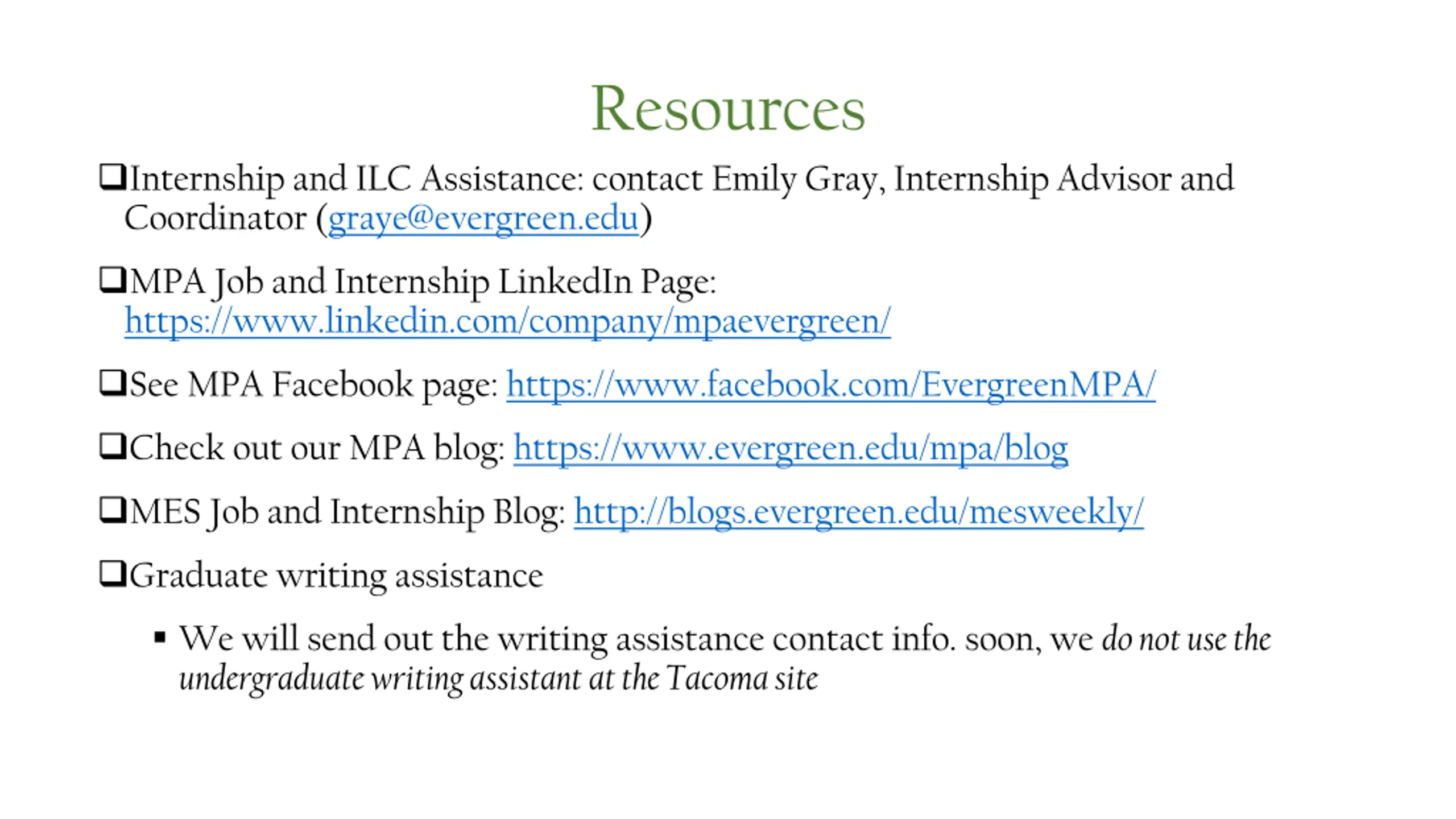Resources Internship and ILC Assistance: contact Emily Gray, Internship Advisor and Coordinator (graye@evergreen.edu) MPA Job and Internship LinkedIn Page: https://www.linkedin.com/company/mpaevergreen/ See MPA Facebook page: https://www.facebook.com/EvergreenMPA/ Check out our MPA blog: https://www.evergreen.edu/mpa/blog MES Job and Internship Blog: http://blogs.evergreen.edu/mesweekly/ Graduate writing assistance We will send out the writing assistance contact info. soon, we do not use the undergraduate writing assistant at the Tacoma site