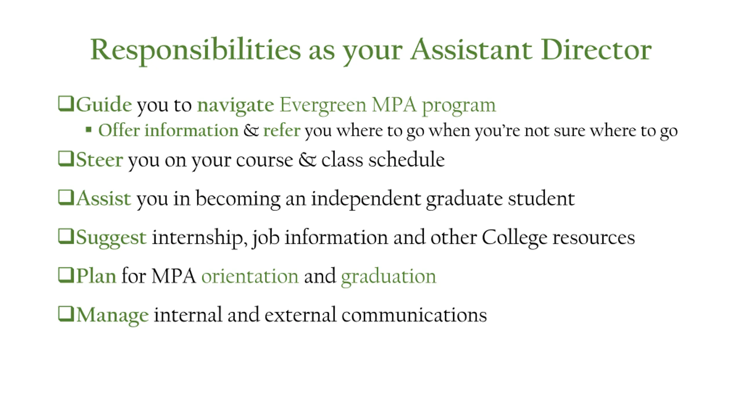 Responsibilities as your Assistant Director Guide you to navigate Evergreen MPA program Offer information & referyou where to go when you re not sure where to go Steer you on your course & class schedule Assist you in becoming an independent graduate student Suggest internship, job information and other College resources Plan for MPA orientation and graduation Manage internal and external communications