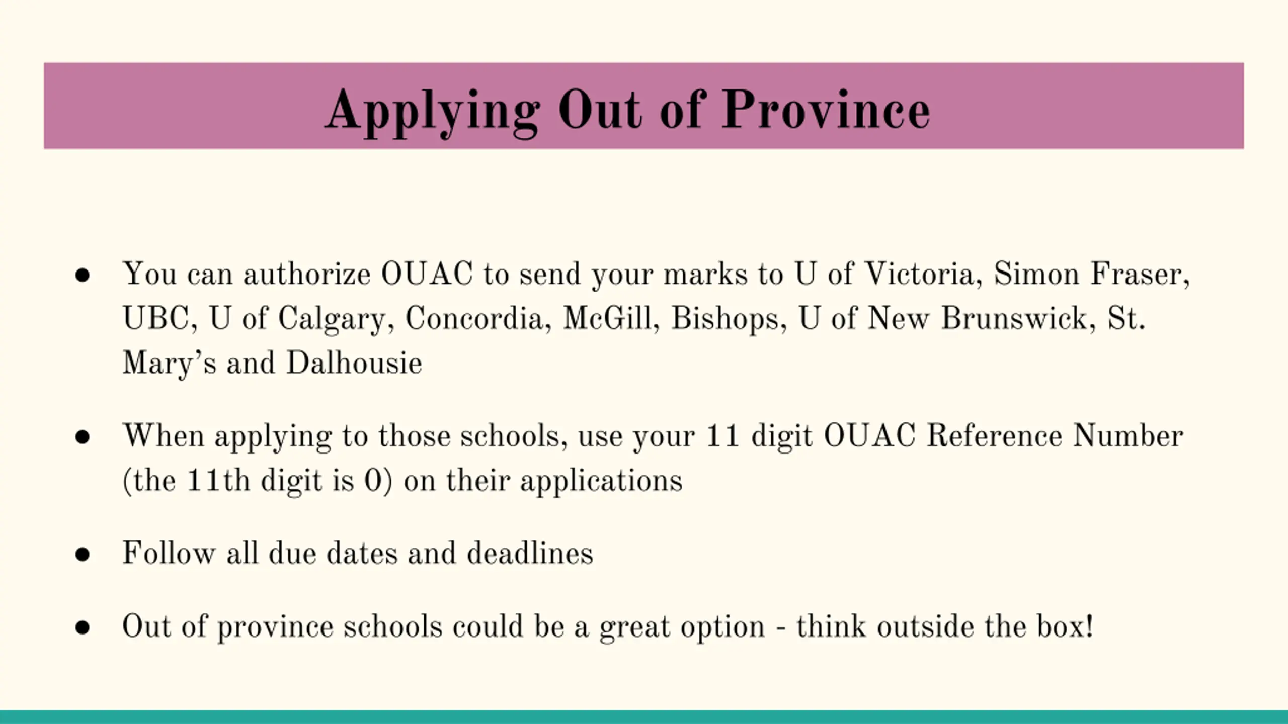 Applying Out of Province You can authorize OUAC to send your marks to U of Victoria, Simon Fraser, UBC, U of Calgary, Concordia, McGill, Bishops, U of New Brunswick, St. Mary s and Dalhousie When applying to those schools, use your 11 digit OUAC Reference Number (the 11th digit is 0) on their applications Follow all due dates and deadlines Out of province schools could be a great option - think outside the box!