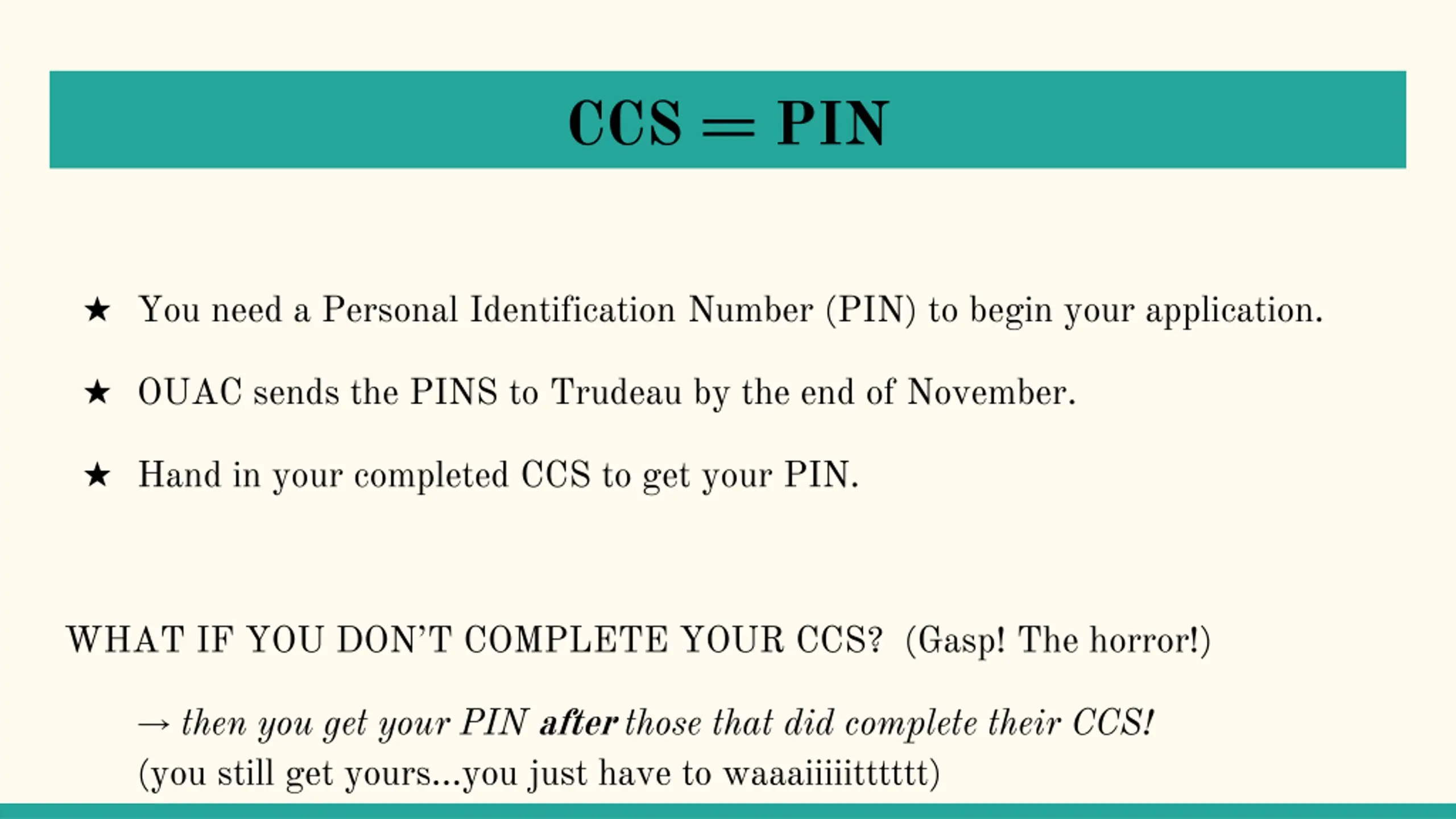 CCS = PIN You need a Personal Identification Number (PIN) to begin your application. OUAC sends the PINS to Trudeau by the end of November. Hand in your completed CCS to get your PIN. WHAT IF YOU DON T COMPLETE YOUR CCS? (Gasp! The horror!) then you get your PIN after those that did complete their CCS! (you still get yours...you just have to waaaiiiiitttttt)