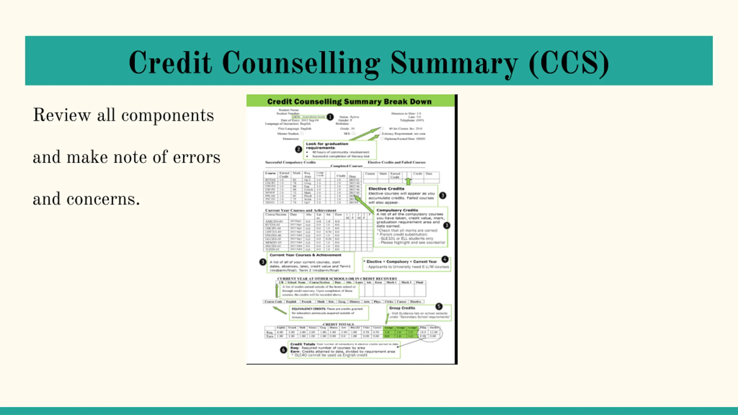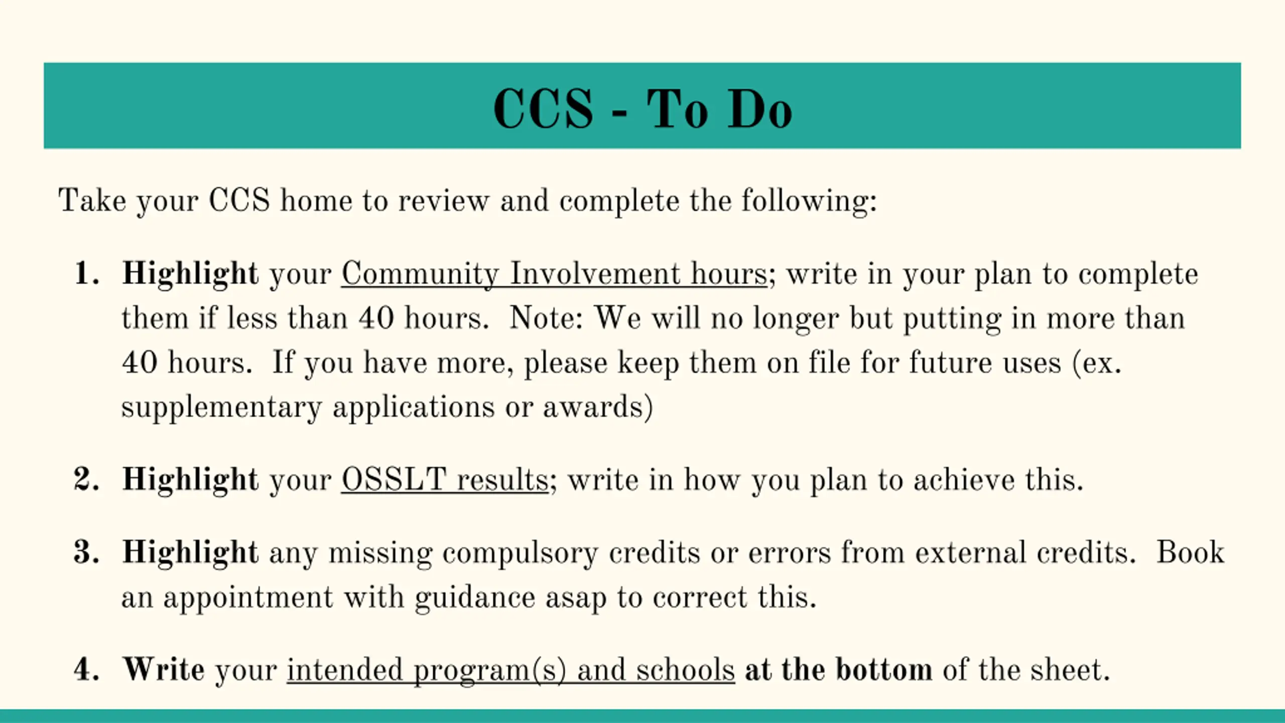 CCS - To Do Take your CCS home to review and complete the following: 1. Highlight your Community Involvement hours; write in your plan to complete them if less than 40 hours. Note: We will no longer but putting in more than 40 hours. If you have more, please keep them on file for future uses (ex. supplementary applications or awards) 2. Highlight your OSSLT results; write in how you plan to achieve this. 3. Highlight any missing compulsory credits or errors from external credits. Book an appointment with guidance asap to correct this. 4. Write your intended program(s) and schools at the bottom of the sheet.