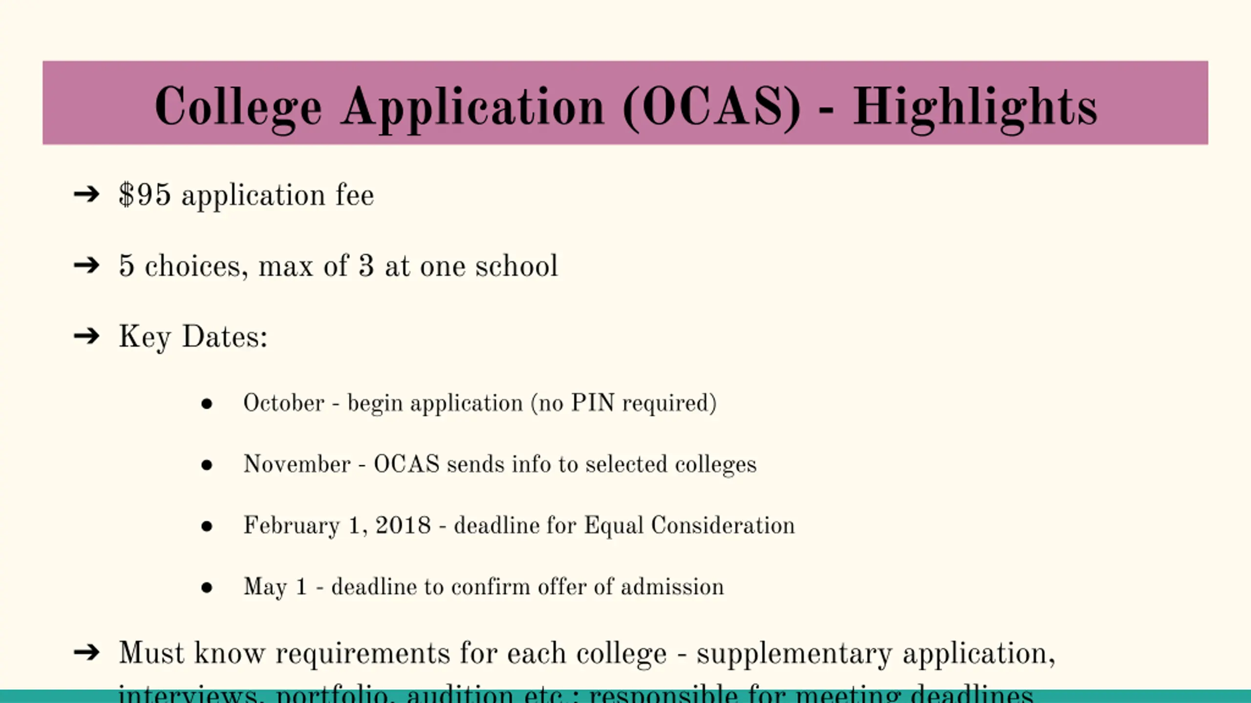 College Application (OCAS) - Highlights $95 application fee 5 choices, max of 3 at one school Key Dates: October - begin application (no PIN required) November - OCAS sends info to selected colleges February 1, 2018 - deadline for Equal Consideration May 1 - deadline to confirm offer of admission Must know requirements for each college - supplementary application, interviews, portfolio, audition etc.; responsible for meeting deadlines