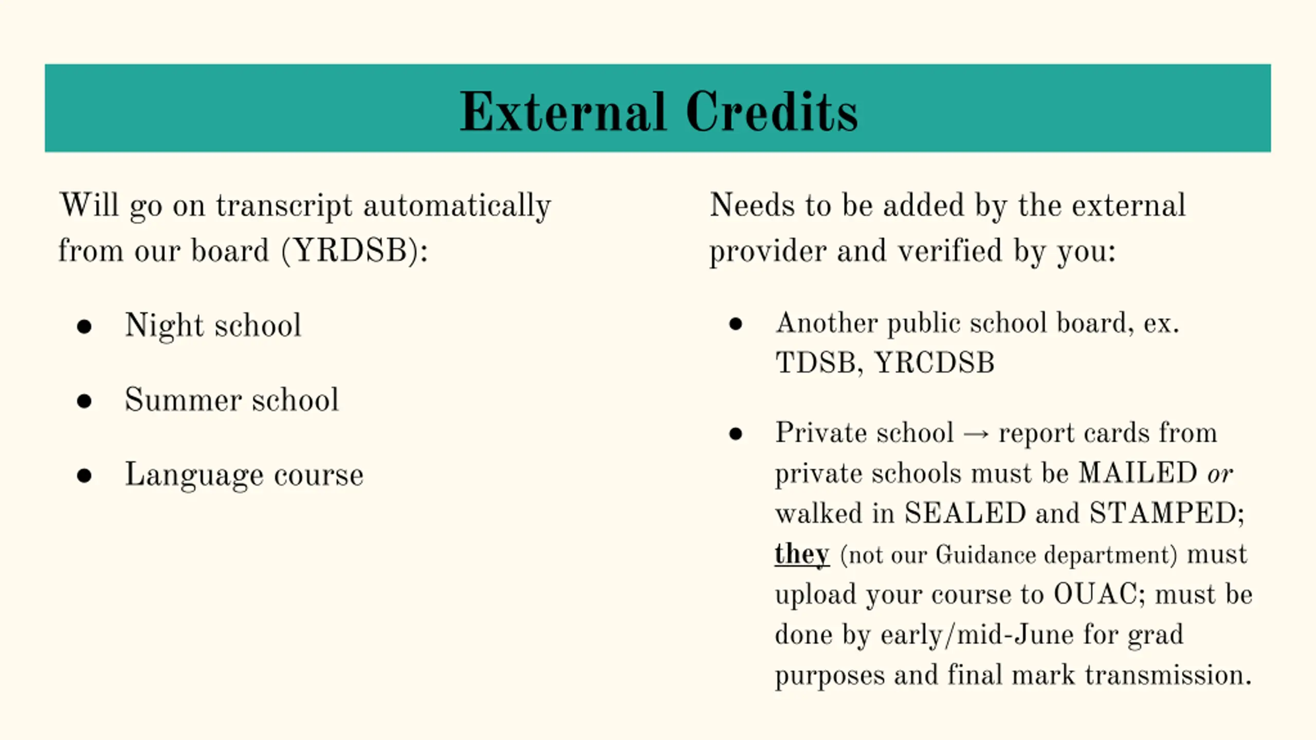 External Credits Will go on transcript automatically from our board (YRDSB): Needs to be added by the external provider and verified by you: Night school Another public school board, ex. TDSB, YRCDSB Summer school Private school report cards from private schools must be MAILED or walked in SEALED and STAMPED; they (not our Guidance department) must upload your course to OUAC; must be done by early/mid-June for grad purposes and final mark transmission. Language course