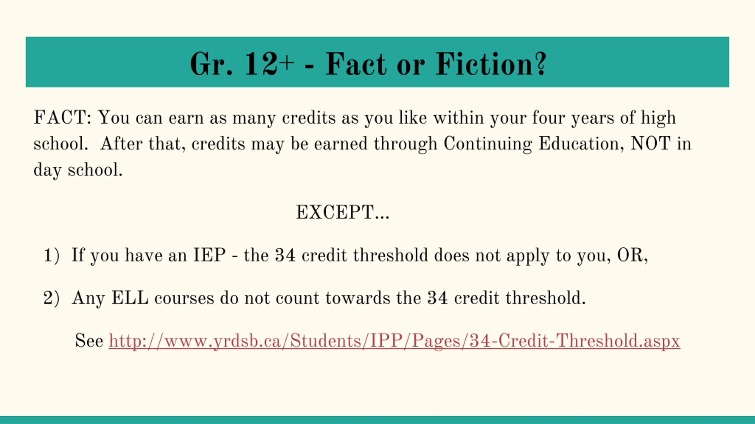 Gr. 12+- Fact or Fiction? FACT: You can earn as many credits as you like within your four years of high school. After that, credits may be earned through Continuing Education, NOT in day school. EXCEPT 1) If you have an IEP - the 34 credit threshold does not apply to you, OR, 2) Any ELL courses do not count towards the 34 credit threshold. See http://www.yrdsb.ca/Students/IPP/Pages/34-Credit-Threshold.aspx