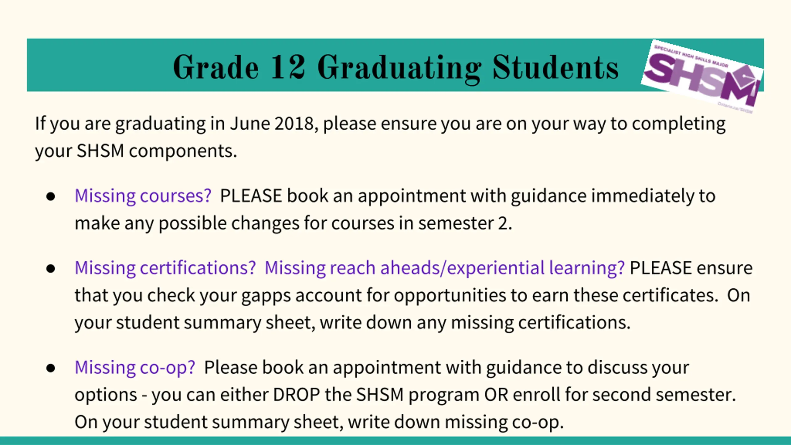 Grade 12 Graduating Students If you are graduating in June 2018, please ensure you are on your way to completing your SHSM components. Missing courses? PLEASE book an appointment with guidance immediately to make any possible changes for courses in semester 2. Missing certifications? Missing reach aheads/experiential learning? PLEASE ensure that you check your gapps account for opportunities to earn these certificates. On your student summary sheet, write down any missing certifications. Missing co-op? Please book an appointment with guidance to discuss your options - you can either DROP the SHSM program OR enroll for second semester. On your student summary sheet, write down missing co-op.