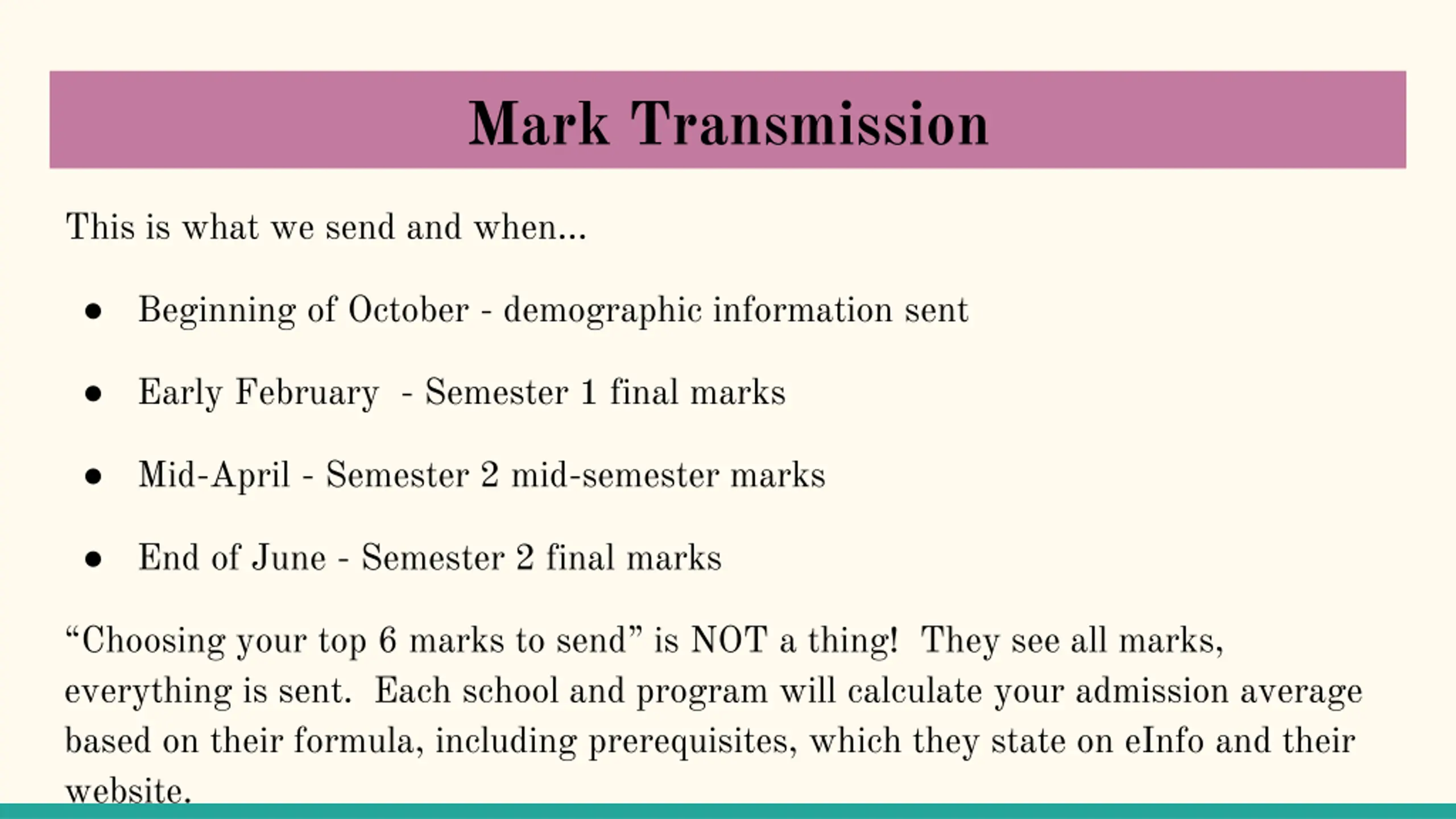 Mark Transmission This is what we send and when Beginning of October - demographic information sent Early February - Semester 1 final marks Mid-April - Semester 2 mid-semester marks End of June - Semester 2 final marks Choosing your top 6 marks to send is NOT a thing! They see all marks, everything is sent. Each school and program will calculate your admission average based on their formula, including prerequisites, which they state on eInfo and their website.