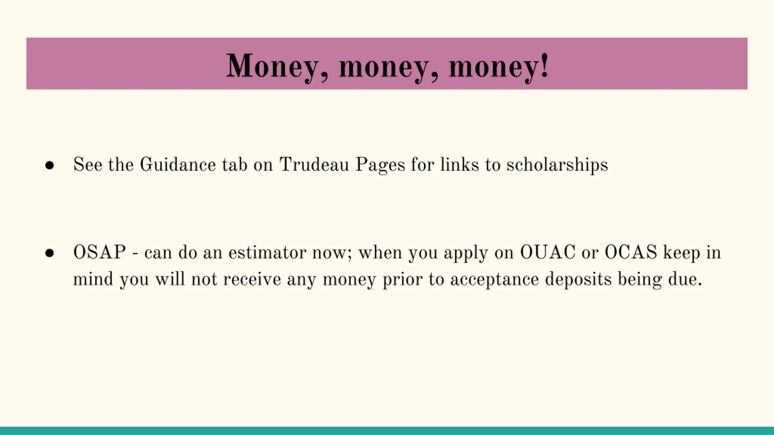 Money, money, money! See the Guidance tab on Trudeau Pages for links to scholarships OSAP - can do an estimator now; when you apply on OUAC or OCAS keep in mind you will not receive any money prior to acceptance deposits being due.