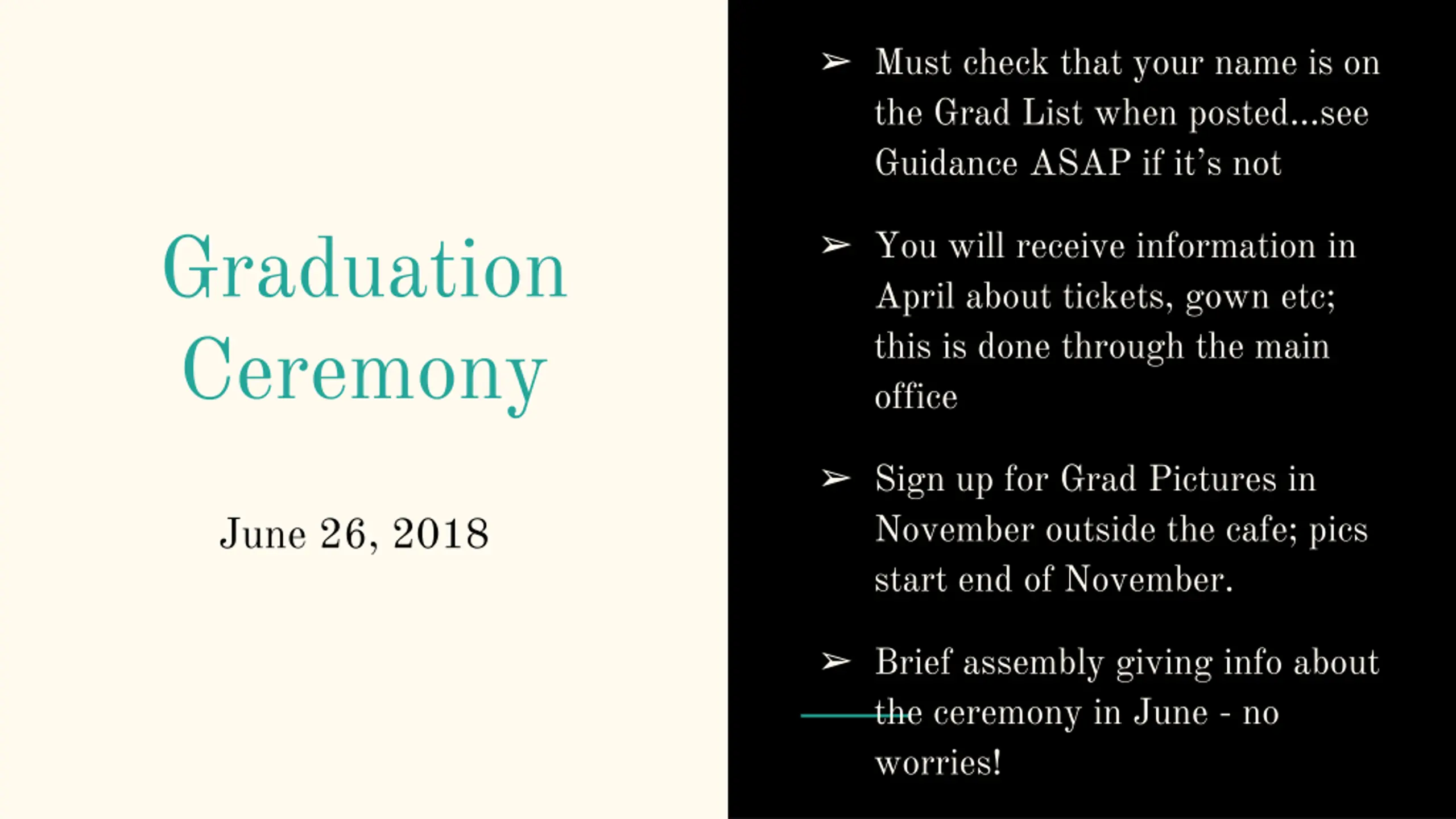 Must check that your name is on the Grad List when posted...see Guidance ASAP if it s not You will receive information in April about tickets, gown etc; this is done through the main office Graduation Ceremony Sign up for Grad Pictures in November outside the cafe; pics start end of November. June 26, 2018 Brief assembly giving info about the ceremony in June - no worries!