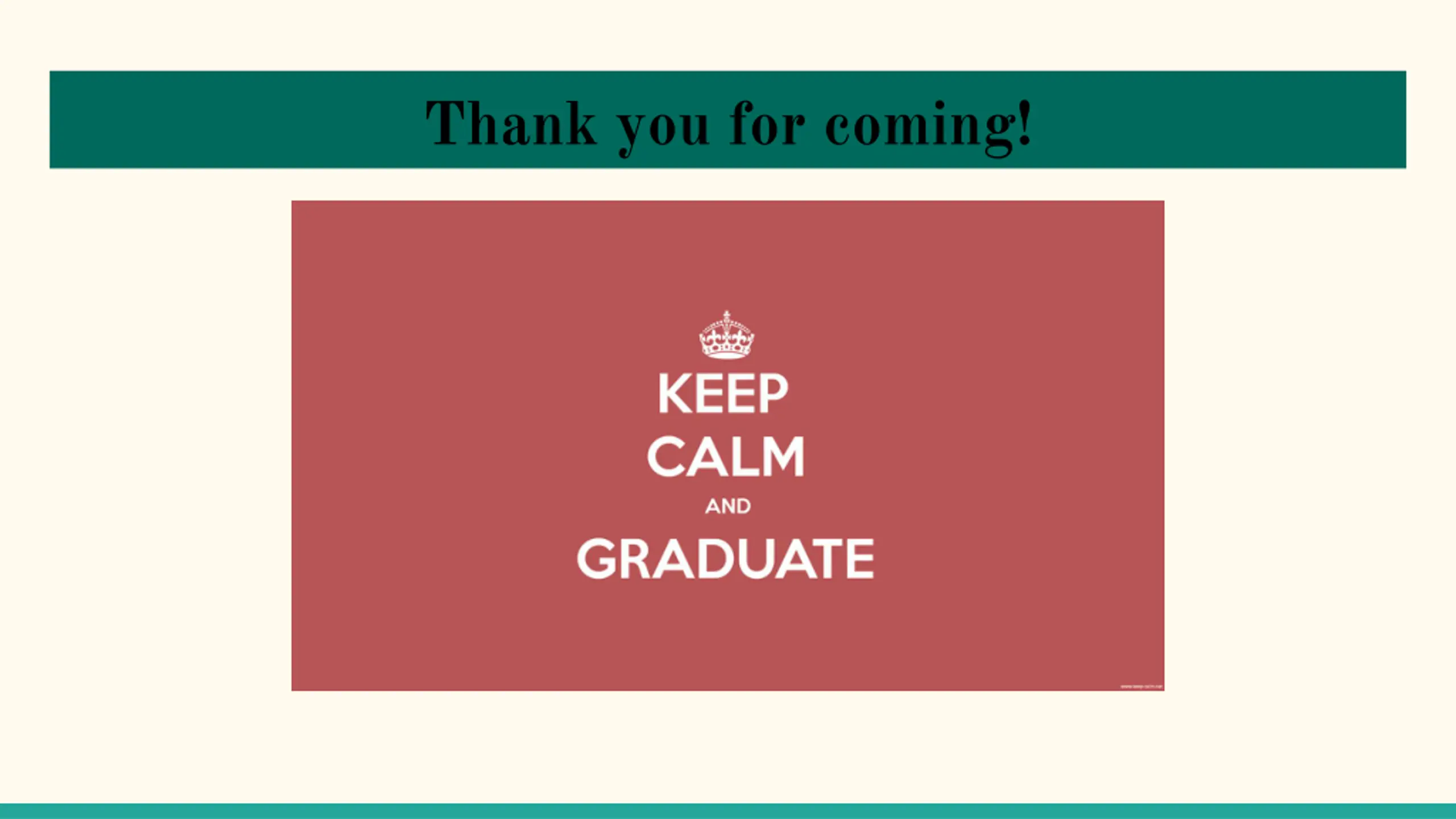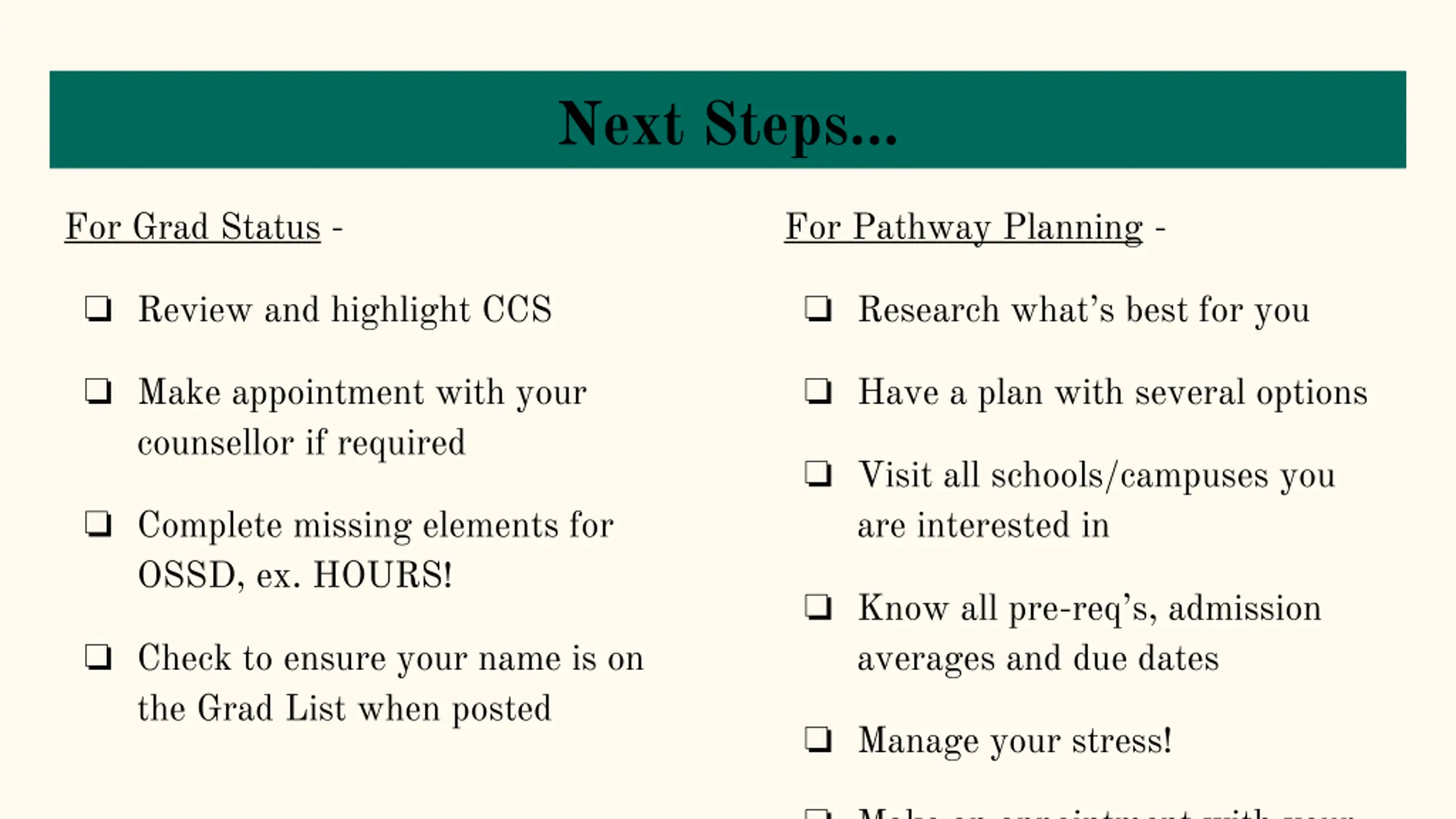 Next Steps... For Grad Status - For Pathway Planning - Review and highlight CCS Research what s best for you Make appointment with your counsellor if required Have a plan with several options Visit all schools/campuses you are interested in Complete missing elements for OSSD, ex. HOURS! Know all pre-req s, admission averages and due dates Check to ensure your name is on the Grad List when posted Manage your stress! Make an appointment with your