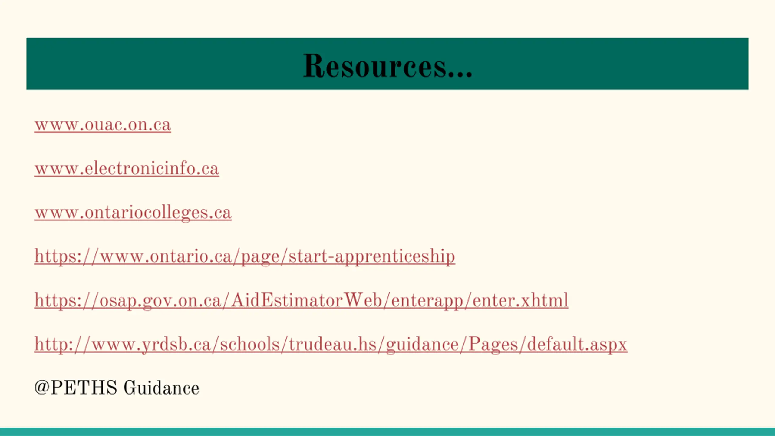 Resources... www.ouac.on.ca www.electronicinfo.ca www.ontariocolleges.ca https://www.ontario.ca/page/start-apprenticeship https://osap.gov.on.ca/AidEstimatorWeb/enterapp/enter.xhtml http://www.yrdsb.ca/schools/trudeau.hs/guidance/Pages/default.aspx @PETHS Guidance