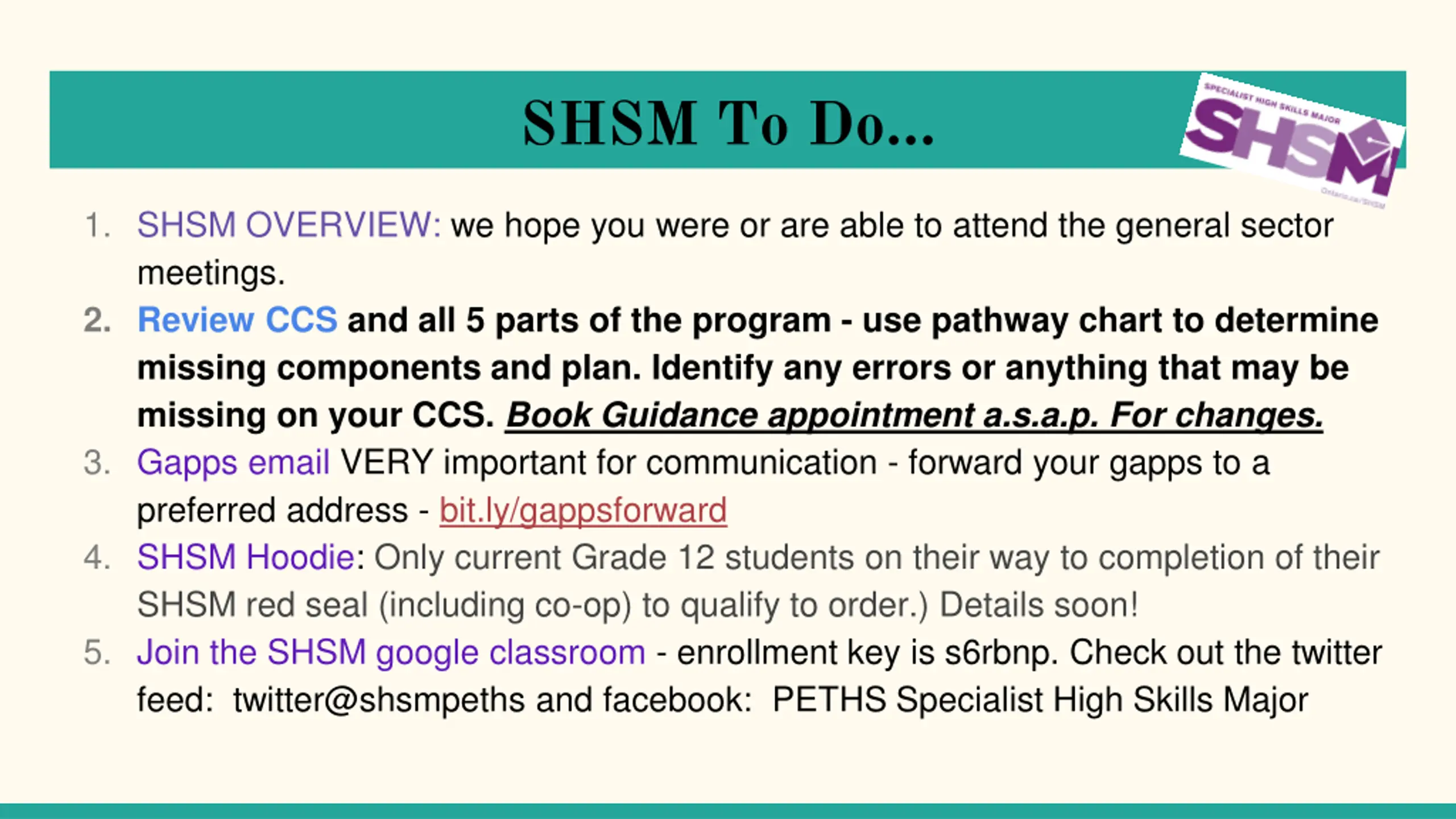 SHSM To Do... 1. SHSM OVERVIEW: we hope you were or are able to attend the general sector meetings. 2. Review CCS and all 5 parts of the program - use pathway chart to determine missing components and plan. Identify any errors or anything that may be missing on your CCS. Book Guidance appointment a.s.a.p. For changes. 3. Gapps email VERY important for communication - forward your gapps to a preferred address - bit.ly/gappsforward 4. SHSM Hoodie: Only current Grade 12 students on their way to completion of their SHSM red seal (including co-op) to qualify to order.) Details soon! 5. Join the SHSM google classroom - enrollment key is s6rbnp. Check out the twitter feed: twitter@shsmpeths and facebook: PETHS Specialist High Skills Major