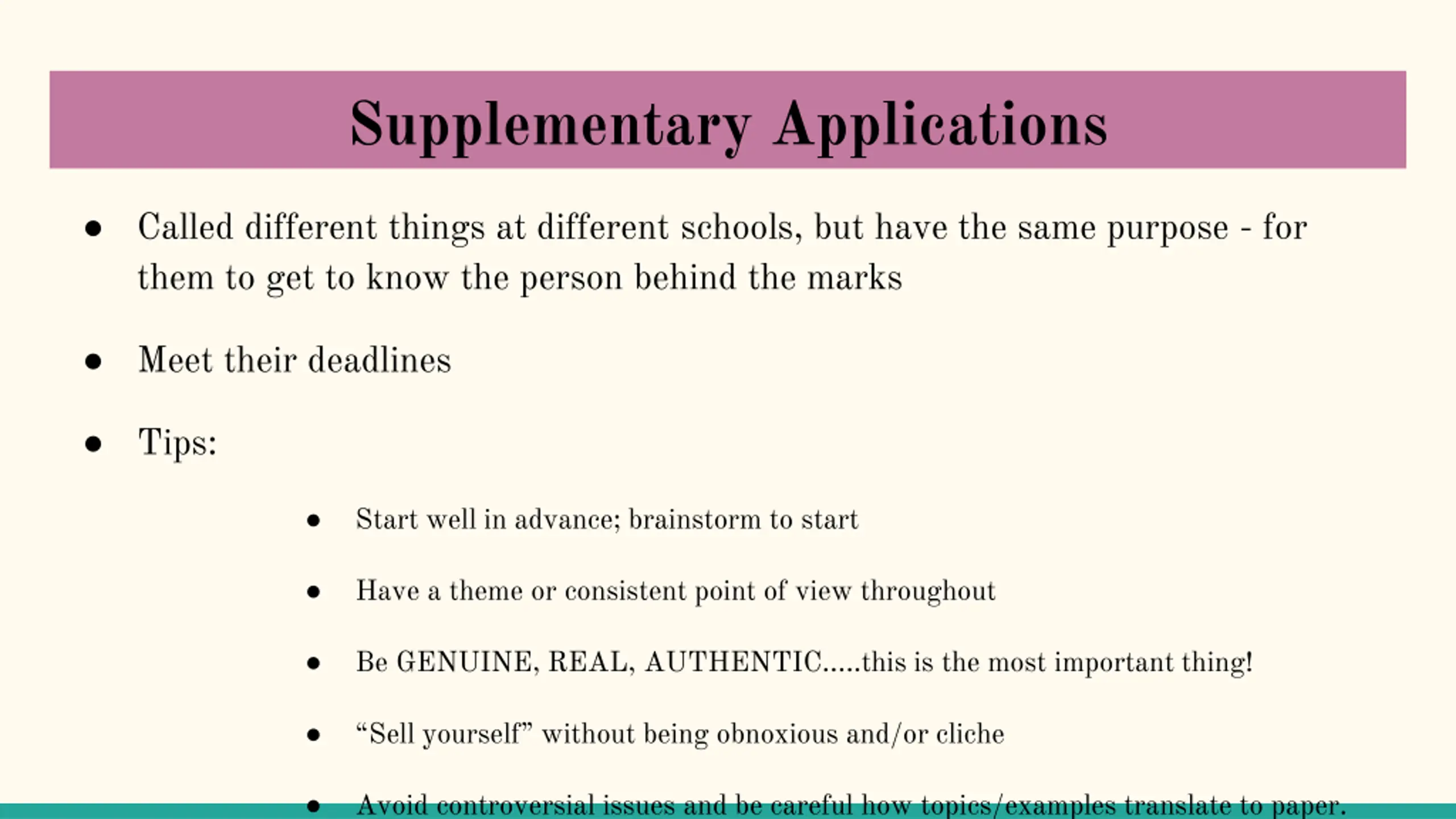 Supplementary Applications Called different things at different schools, but have the same purpose - for them to get to know the person behind the marks Meet their deadlines Tips: Start well in advance; brainstorm to start Have a theme or consistent point of view throughout Be GENUINE, REAL, AUTHENTIC ..this is the most important thing! Sell yourself without being obnoxious and/or cliche Avoid controversial issues and be careful how topics/examples translate to paper.