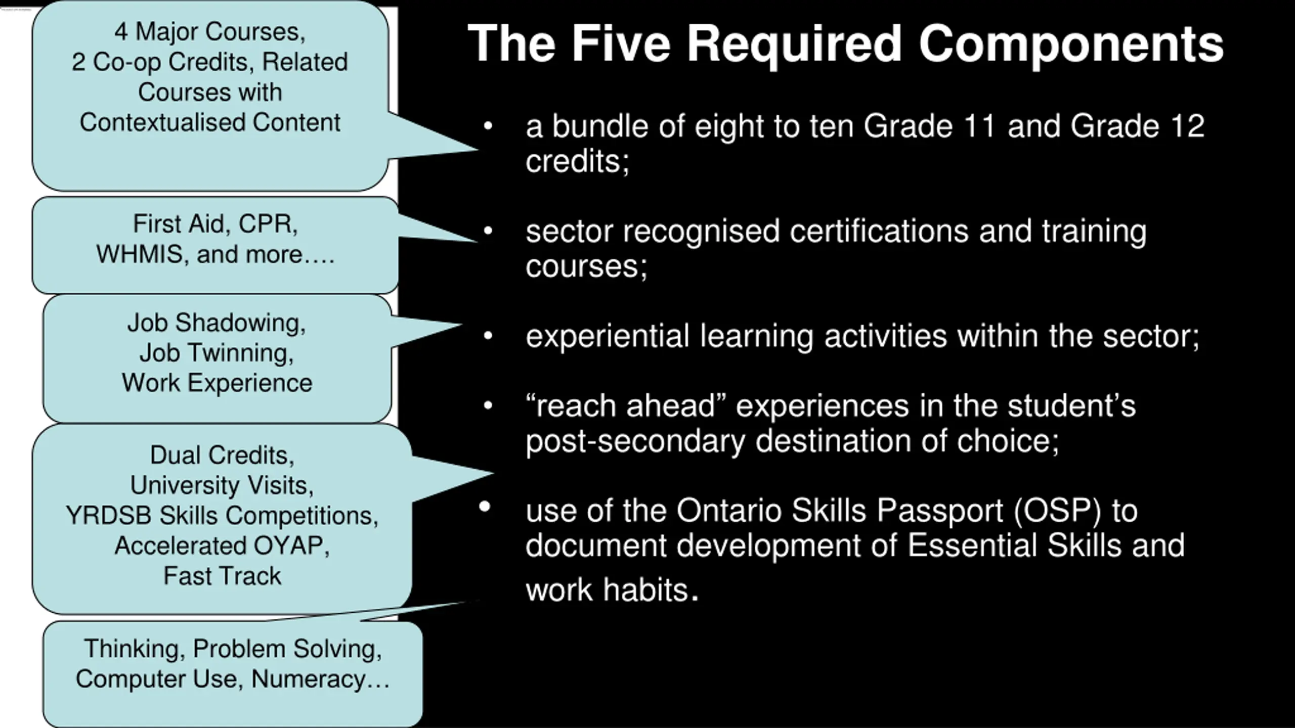 The Five Required Components 4 Major Courses, 2 Co-op Credits, Related Courses with Contextualised Content a bundle of eight to ten Grade 11 and Grade 12 credits; First Aid, CPR, WHMIS, and more . sector recognised certifications and training courses; Job Shadowing, Job Twinning, Work Experience experiential learning activities within the sector; reach ahead experiences in the student s post-secondary destination of choice; Dual Credits, University Visits, YRDSB Skills Competitions, Accelerated OYAP, Fast Track use of the Ontario Skills Passport (OSP) to document development of Essential Skills and work habits. Thinking, Problem Solving, Computer Use, Numeracy