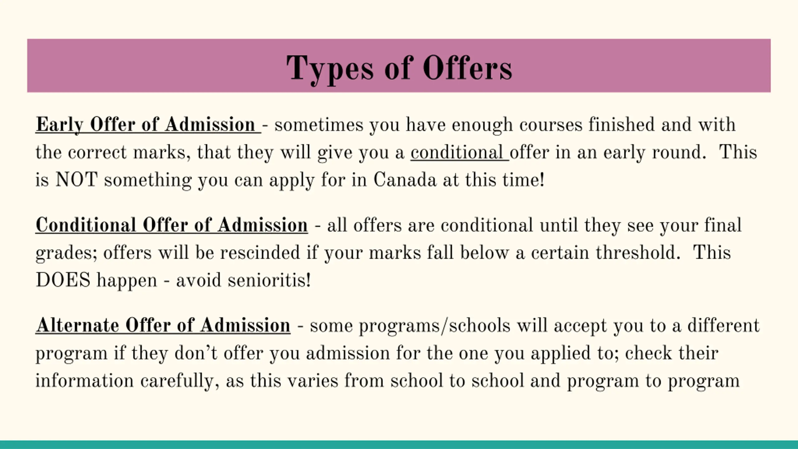 Types of Offers Early Offer of Admission - sometimes you have enough courses finished and with the correct marks, that they will give you a conditional offer in an early round. This is NOT something you can apply for in Canada at this time! Conditional Offer of Admission - all offers are conditional until they see your final grades; offers will be rescinded if your marks fall below a certain threshold. This DOES happen - avoid senioritis! Alternate Offer of Admission - some programs/schools will accept you to a different program if they don t offer you admission for the one you applied to; check their information carefully, as this varies from school to school and program to program