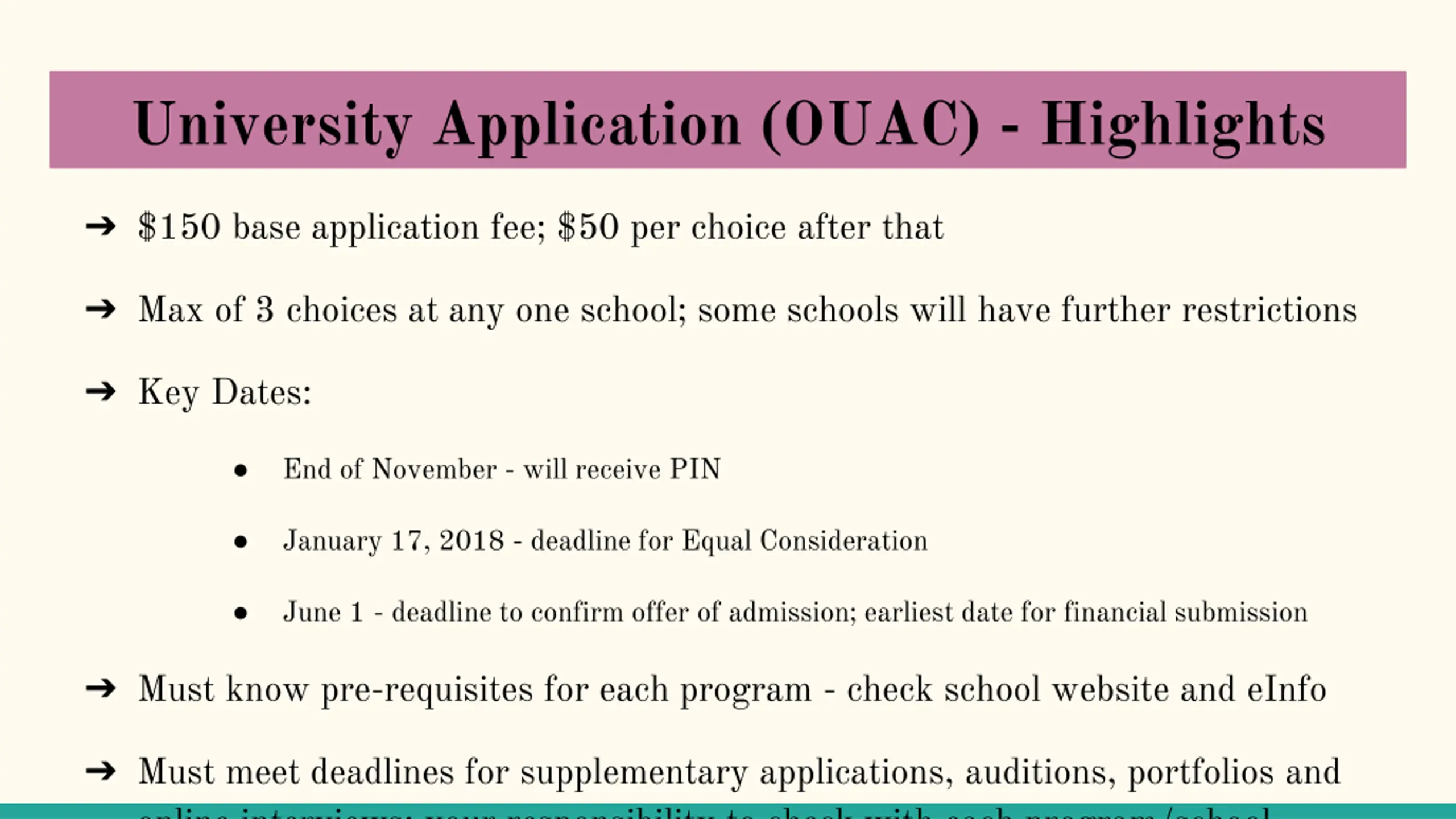 University Application (OUAC) - Highlights $150 base application fee; $50 per choice after that Max of 3 choices at any one school; some schools will have further restrictions Key Dates: End of November - will receive PIN January 17, 2018 - deadline for Equal Consideration June 1 - deadline to confirm offer of admission; earliest date for financial submission Must know pre-requisites for each program - check school website and eInfo Must meet deadlines for supplementary applications, auditions, portfolios and online interviews; your responsibility to check with each program/school