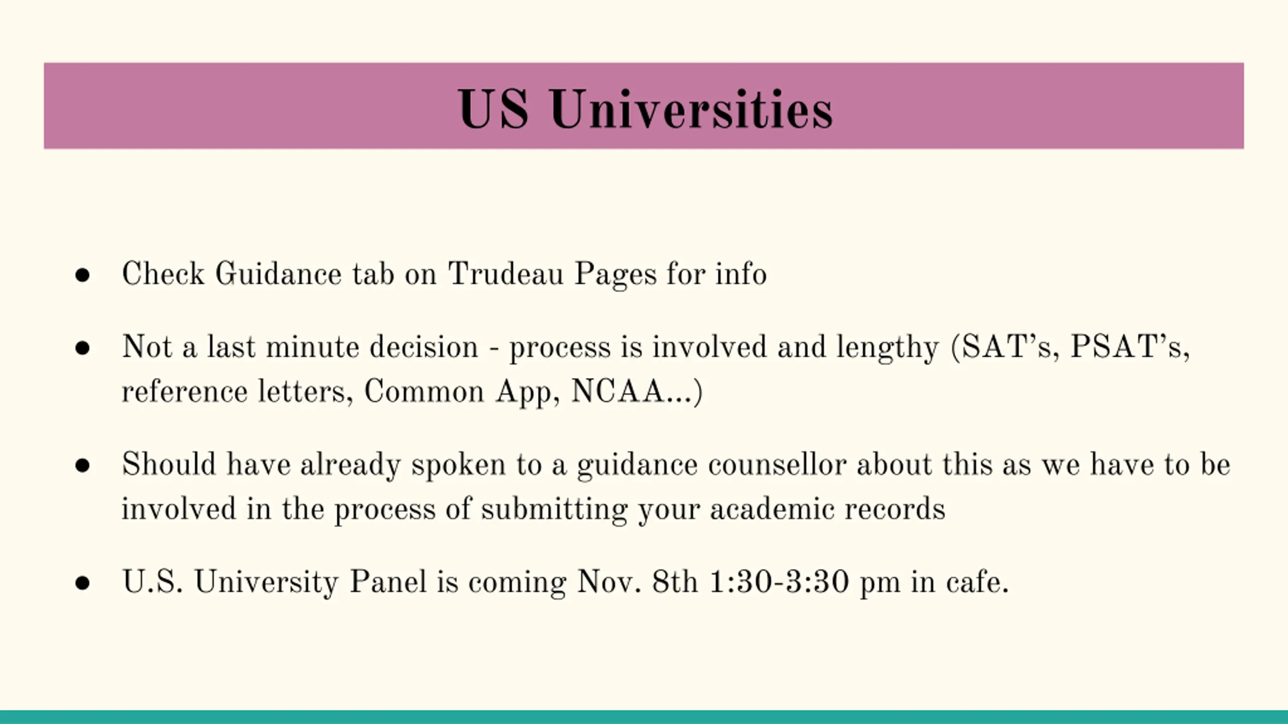 US Universities Check Guidance tab on Trudeau Pages for info Not a last minute decision - process is involved and lengthy (SAT s, PSAT s, reference letters, Common App, NCAA ) Should have already spoken to a guidance counsellor about this as we have to be involved in the process of submitting your academic records U.S. University Panel is coming Nov. 8th 1:30-3:30 pm in cafe.