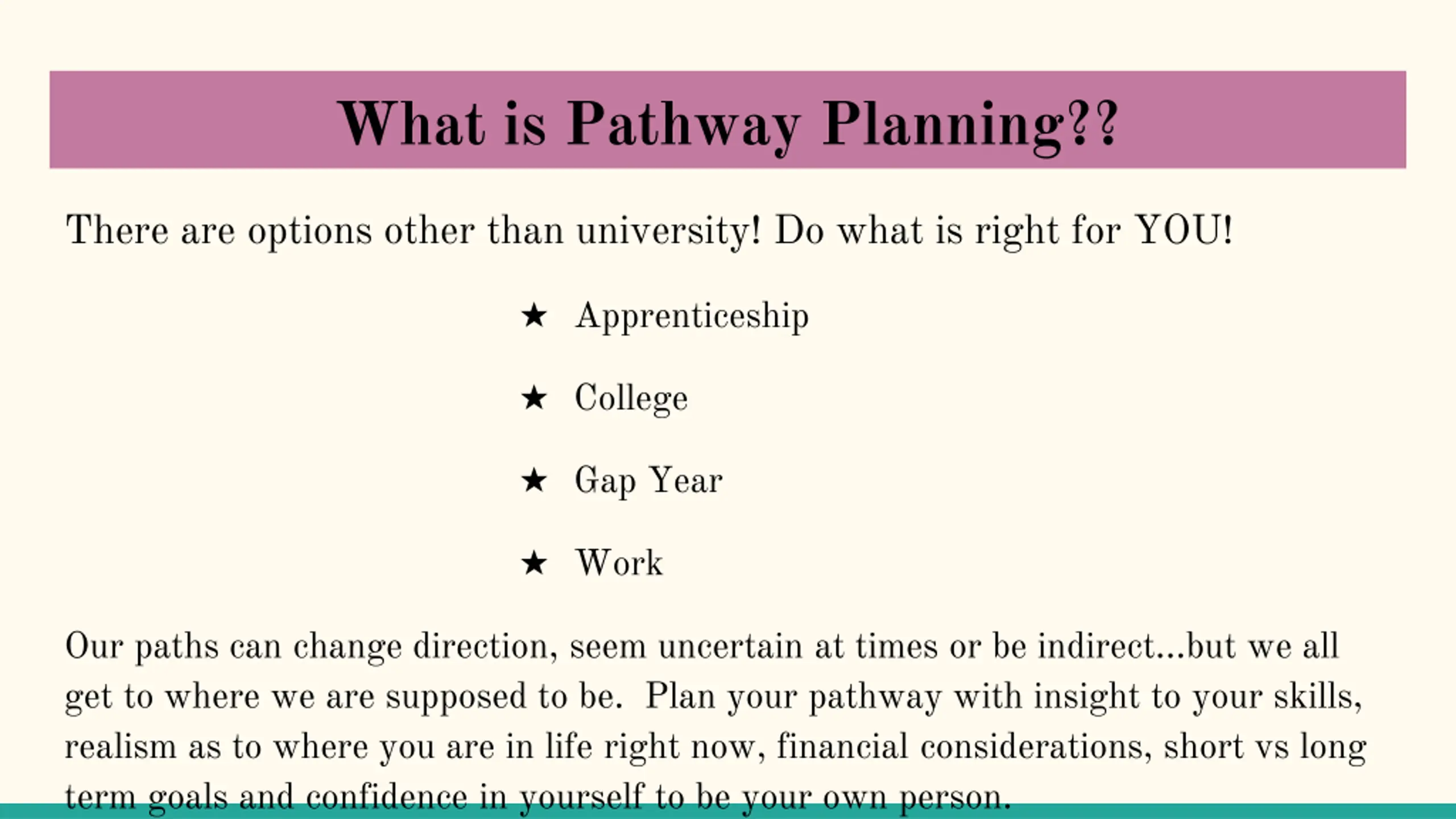 What is Pathway Planning?? There are options other than university! Do what is right for YOU! Apprenticeship College Gap Year Work Our paths can change direction, seem uncertain at times or be indirect...but we all get to where we are supposed to be. Plan your pathway with insight to your skills, realism as to where you are in life right now, financial considerations, short vs long term goals and confidence in yourself to be your own person.