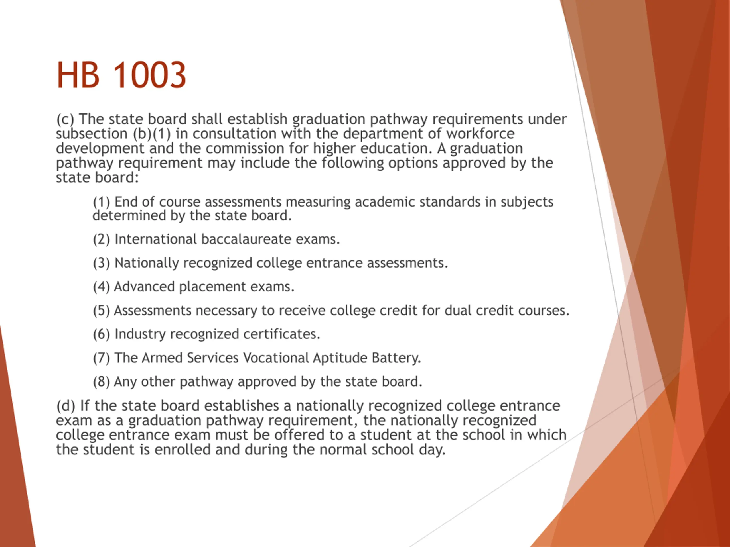 HB 1003 (c) The state board shall establish graduation pathway requirements under subsection (b)(1) in consultation with the department of workforce development and the commission for higher education. A graduation pathway requirement may include the following options approved by the state board: (1) End of course assessments measuring academic standards in subjects determined by the state board. (2) International baccalaureate exams. (3) Nationally recognized college entrance assessments. (4) Advanced placement exams. (5) Assessments necessary to receive college credit for dual credit courses. (6) Industry recognized certificates. (7) The Armed Services Vocational Aptitude Battery. (8) Any other pathway approved by the state board. (d) If the state board establishes a nationally recognized college entrance exam as a graduation pathway requirement, the nationally recognized college entrance exam must be offered to a student at the school in which the student is enrolled and during the normal school day.
