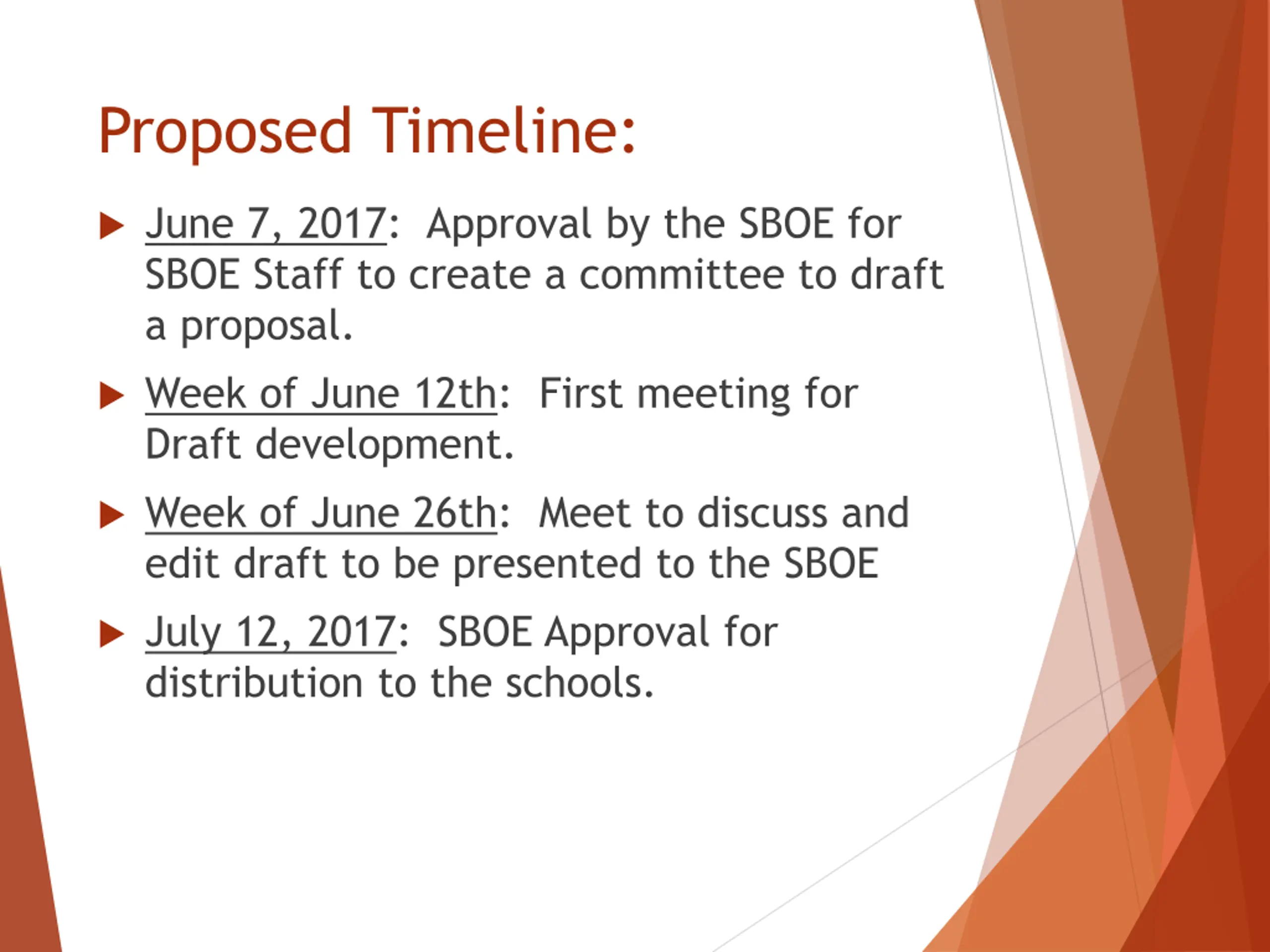 Proposed Timeline: June 7, 2017: Approval by the SBOE for SBOE Staff to create a committee to draft a proposal. Week of June 12th: First meeting for Draft development. Week of June 26th: Meet to discuss and edit draft to be presented to the SBOE July 12, 2017: SBOE Approval for distribution to the schools.